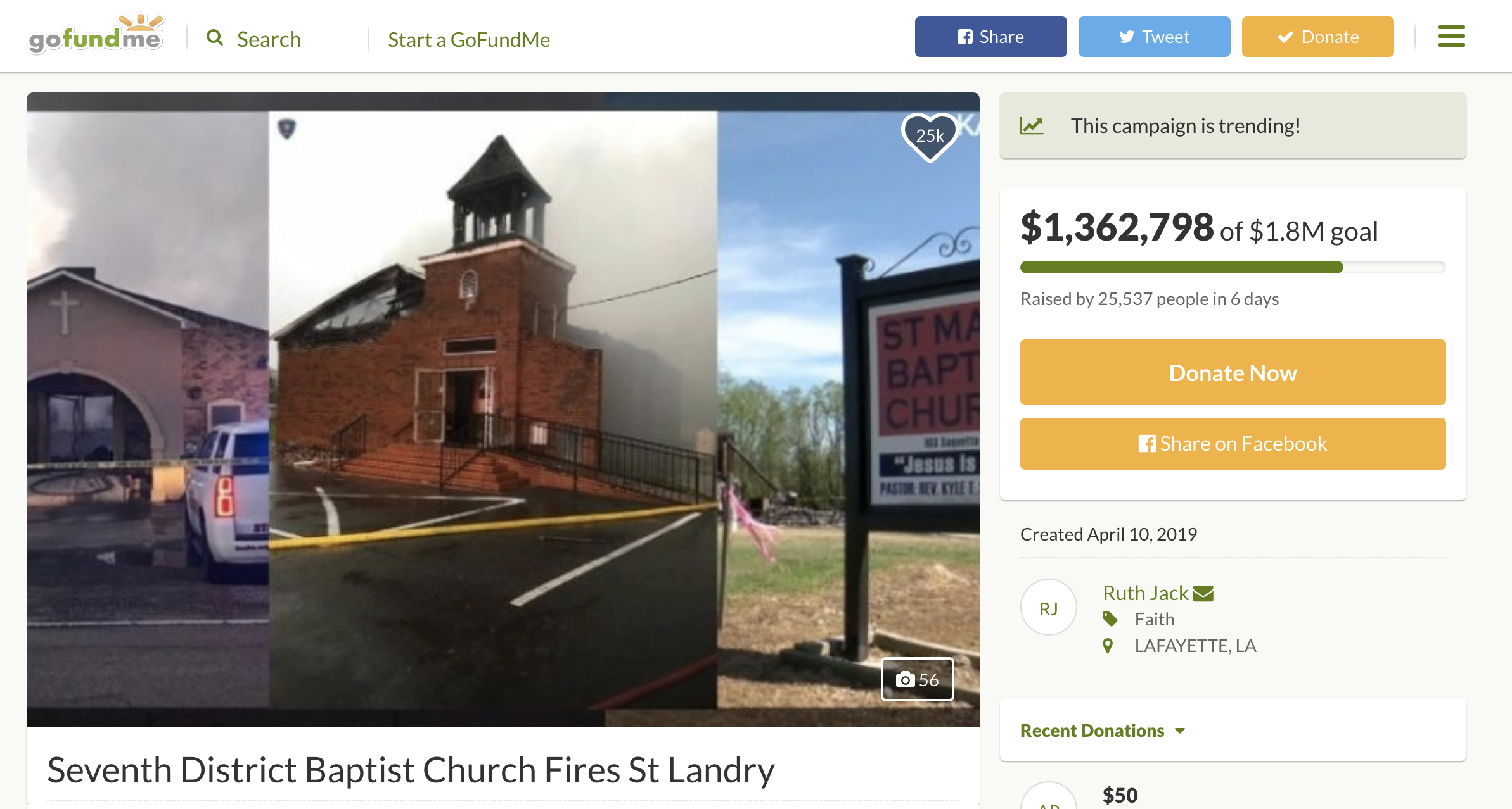 While billionaires publicly pledged hundreds of millions of euros in support of the restoration of the Notre-Dame cathedral in Paris, a crowdfunding campaign to rebuild three Black Louisiana churches that were destroyed in arson attacks has skyrocketed. The campaign’s GoFundMe total spiked from just below $50,000 on Sunday to above $1.3 million today.