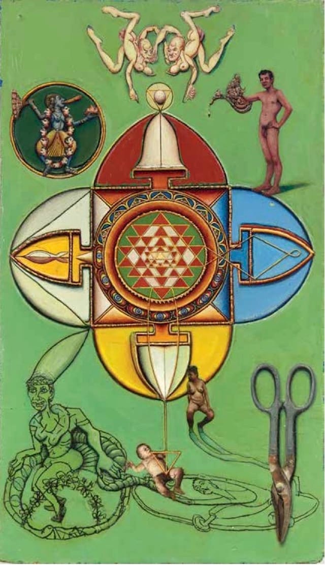 Gregory Gillespie, “Mandala with Shears” (1996), oil on board, 32 1⁄4 x 19 1/8 inches (click to enlarge)