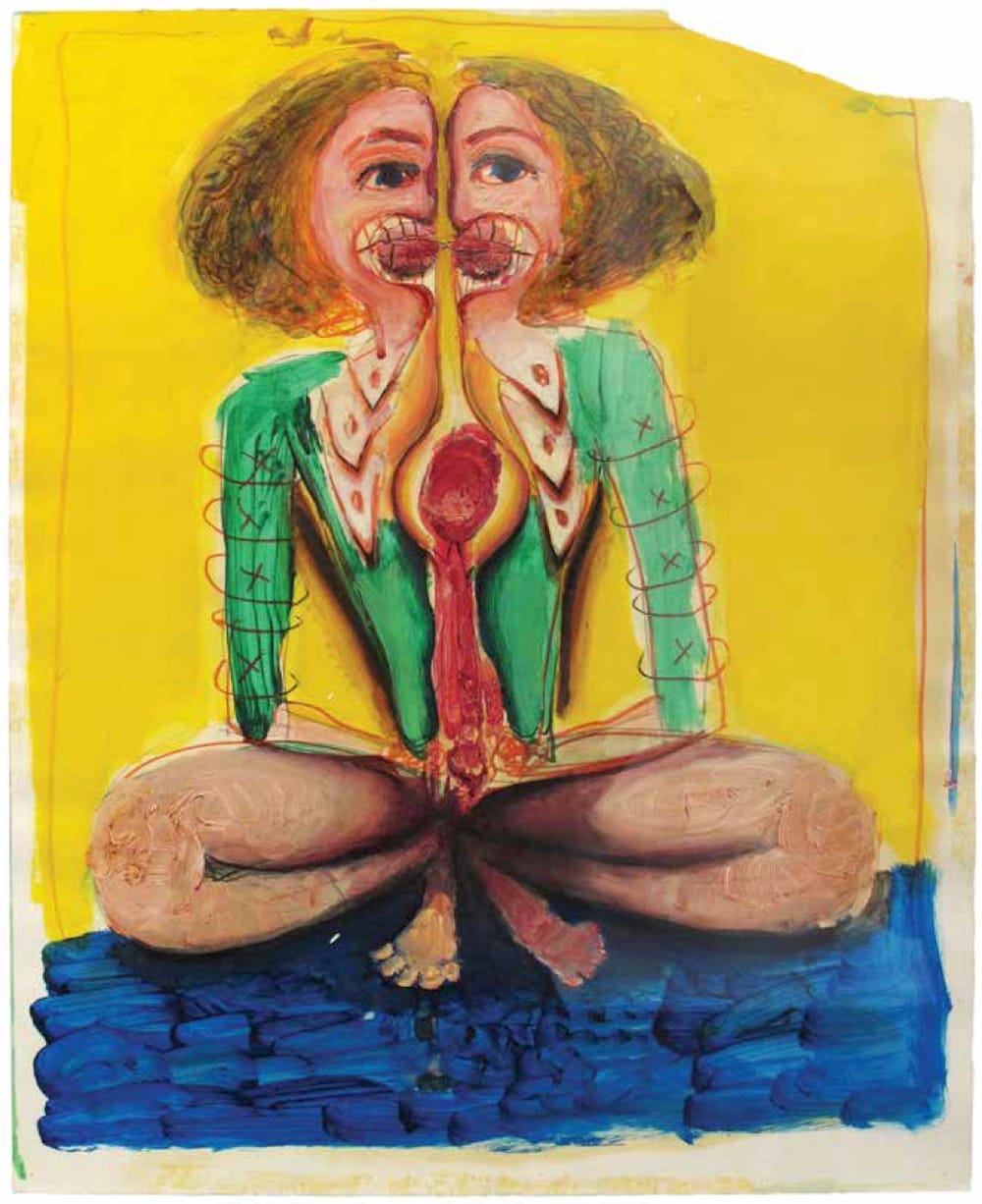 Gregory Gillespie, “Meditating Double Woman” (n.d.), oil and mixed media on paper, 17 x 14 inches