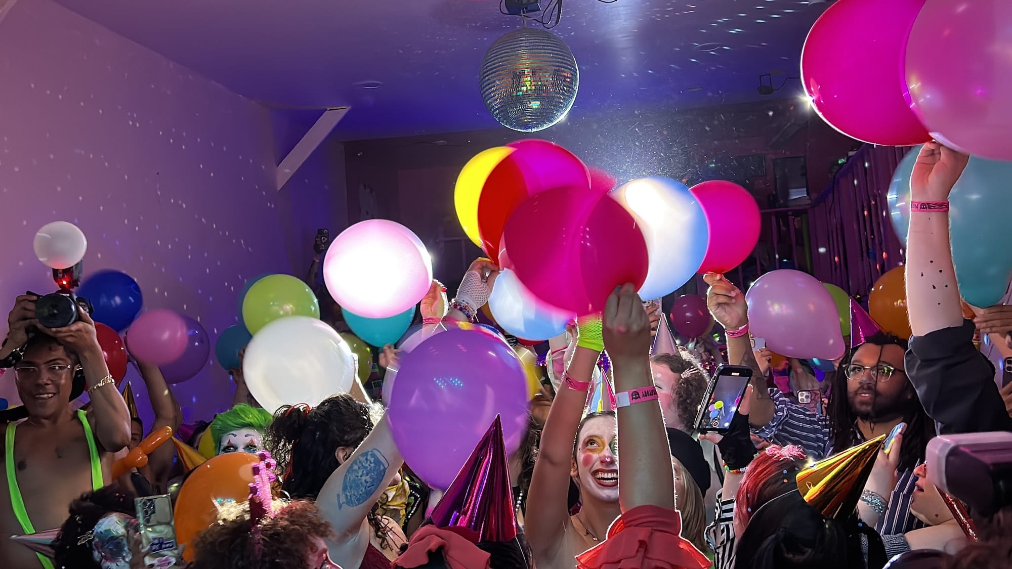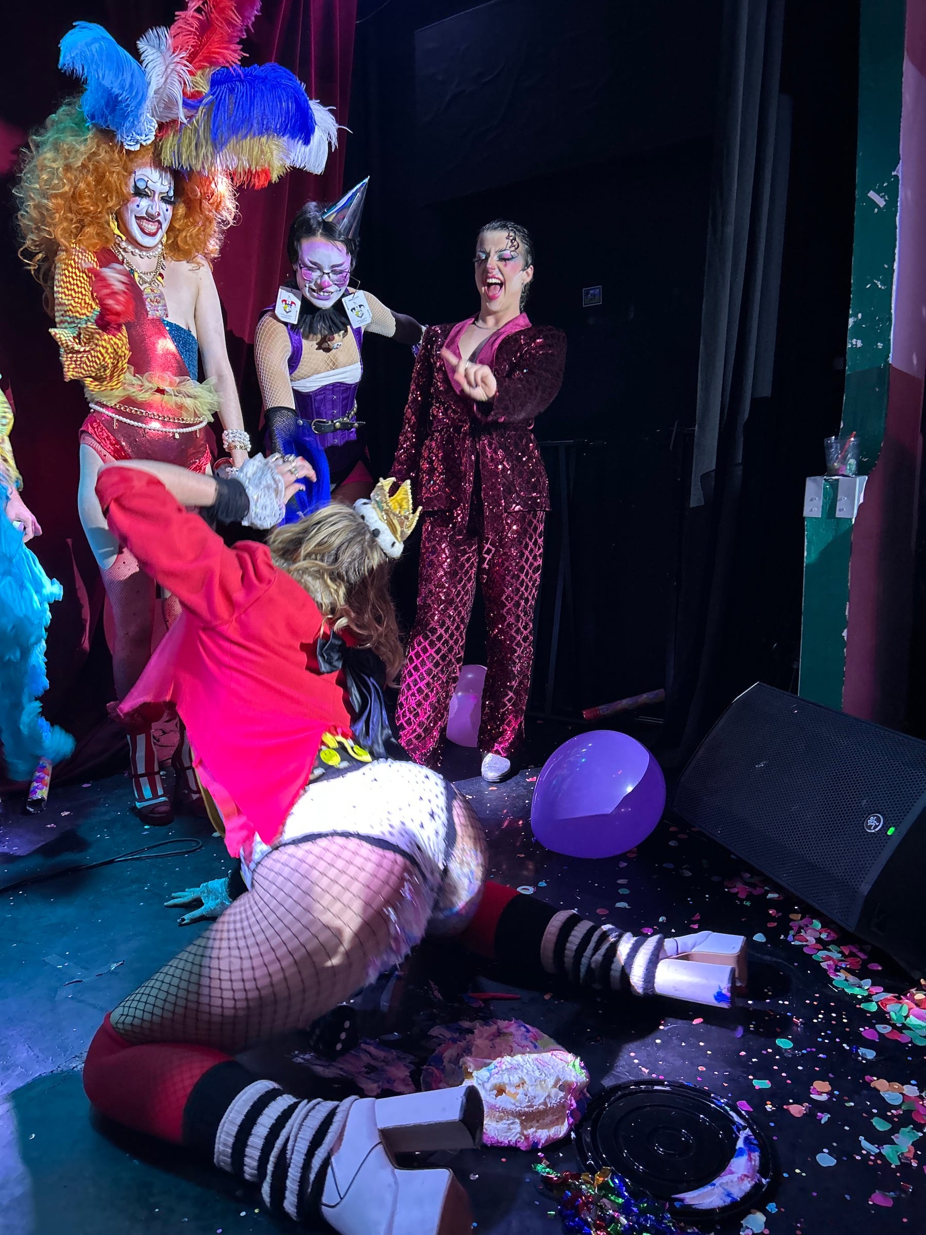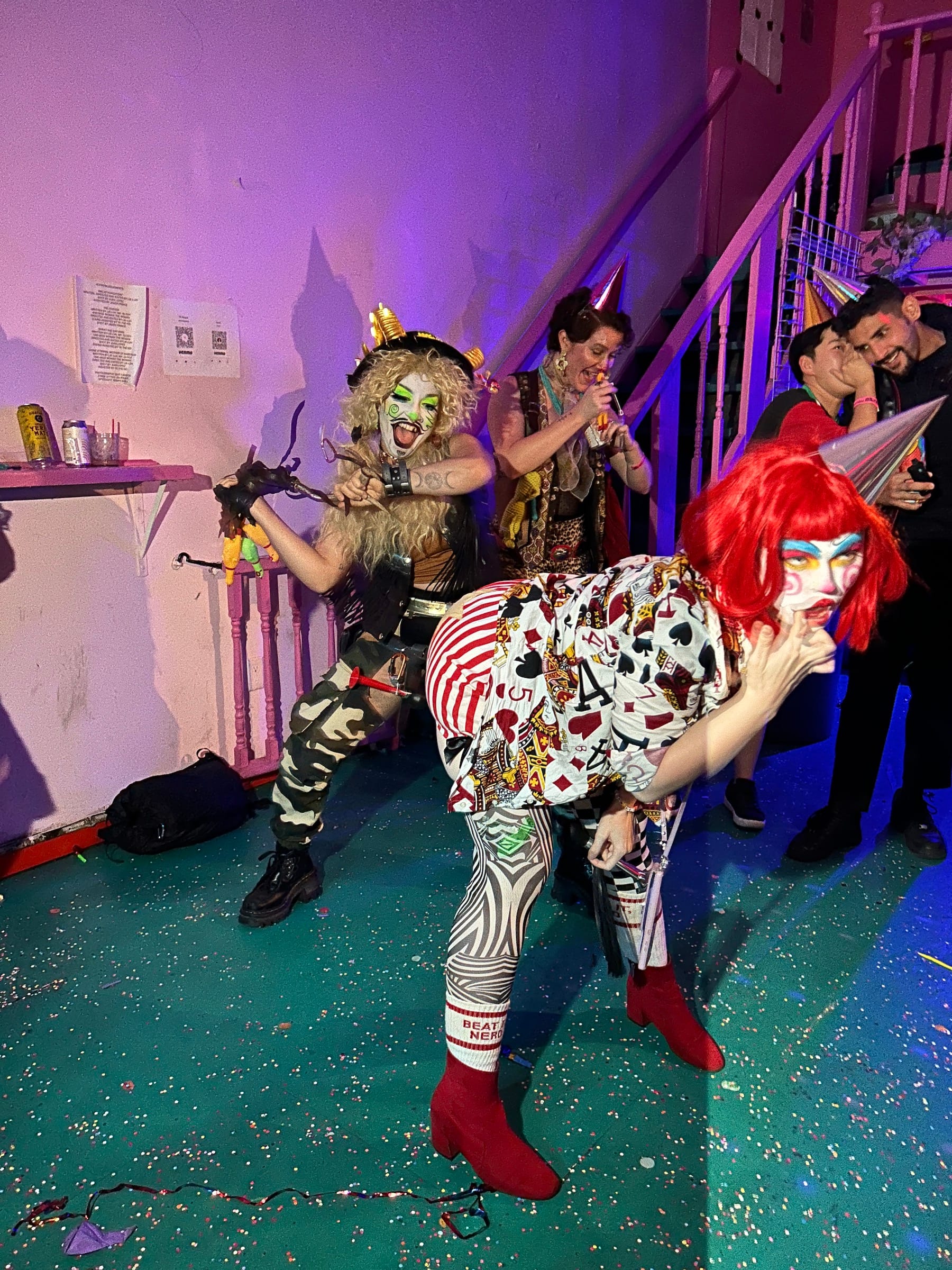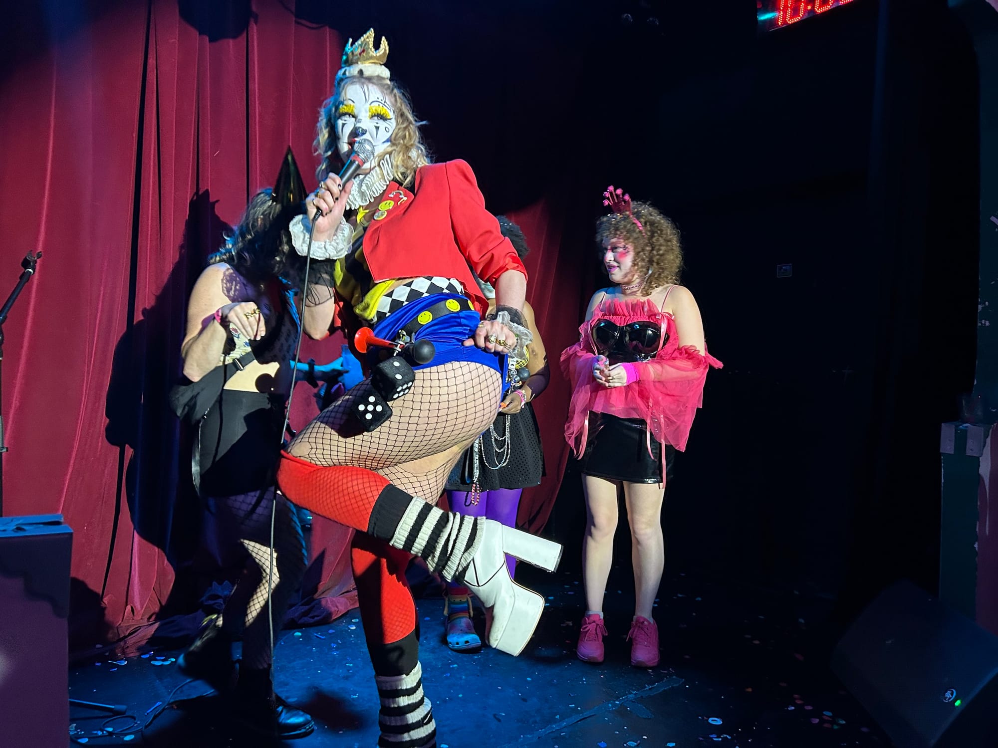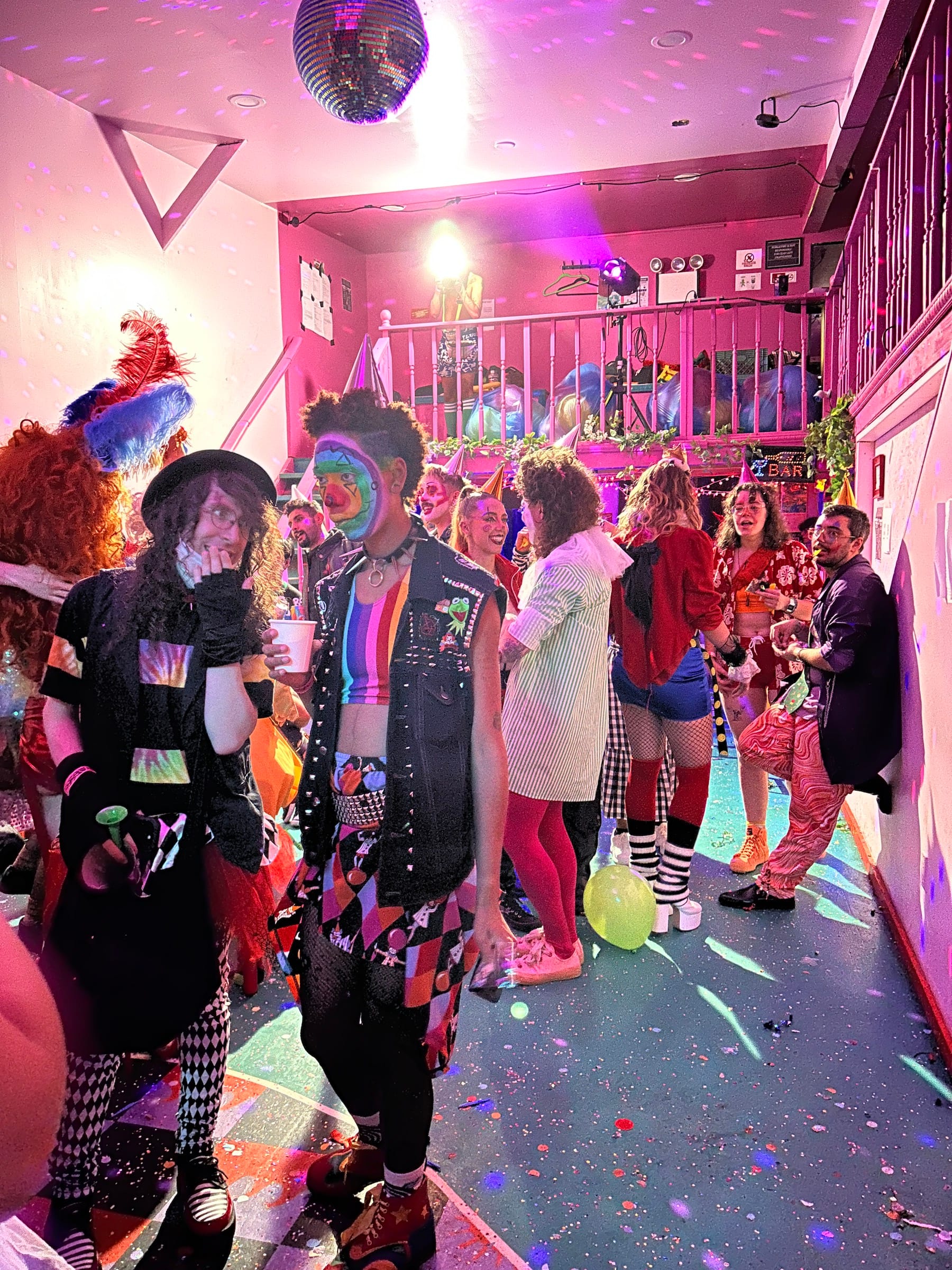 It was shortly after 8pm on Sunday, June 30, when I arrived at Purgatory, a queer owned-and-operated dive bar and music venue in Bushwick, Brooklyn. I put on my costume (a red foam nose) and found myself face-to-face with other similar, though more elaborately dressed, individuals wearing white face paint and drawn-on smiles. As I climbed up a narrow staircase bathed in red light, a towering clown in a thong fishnet suit and whiteout contact lenses descended past me, and at the top, I was greeted by a giddy clown with golden ram horns protruding from their head who handed me a party hat and a noisemaker.