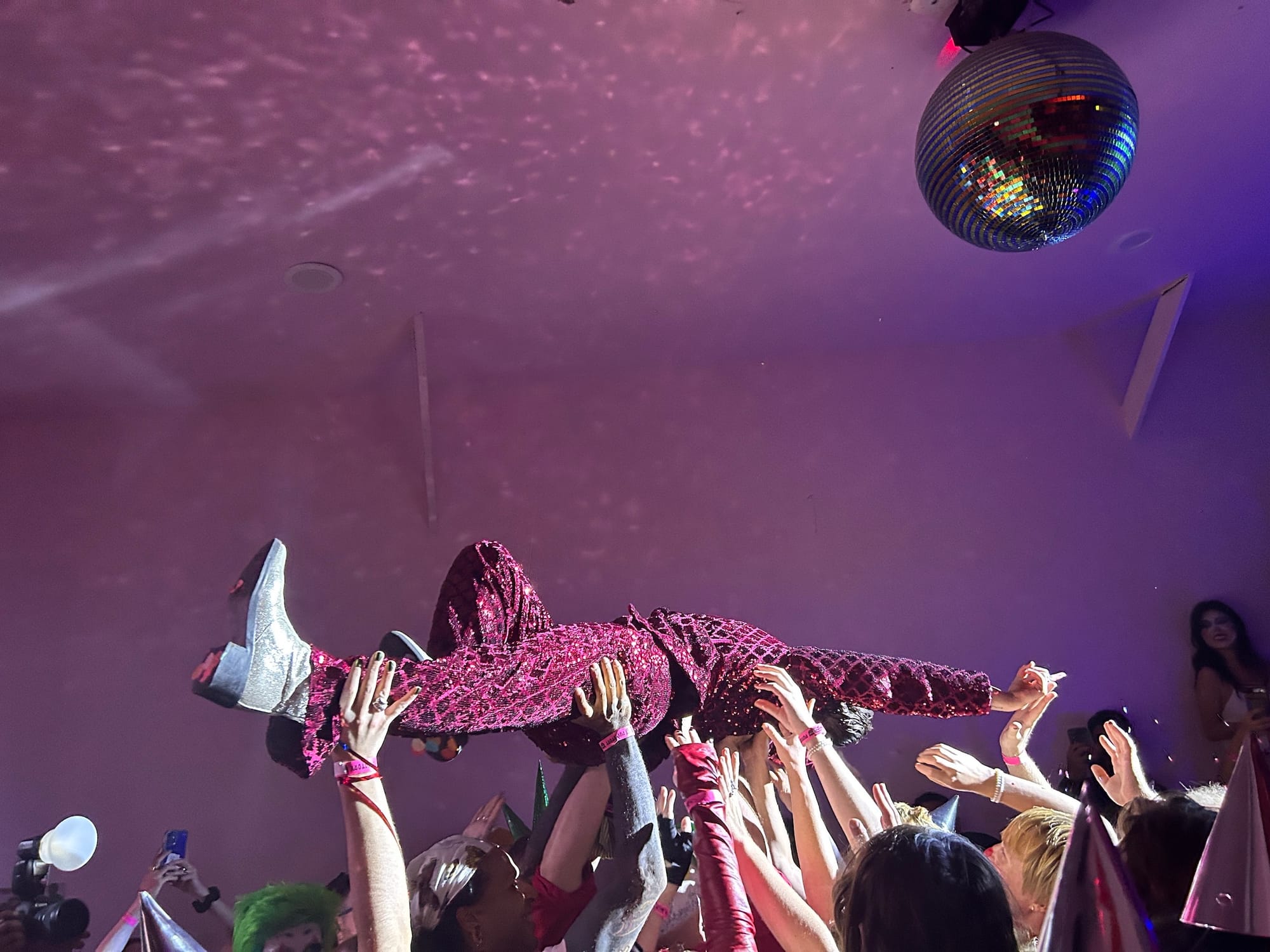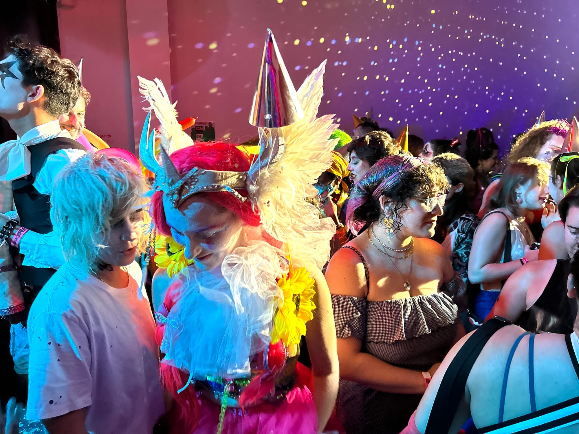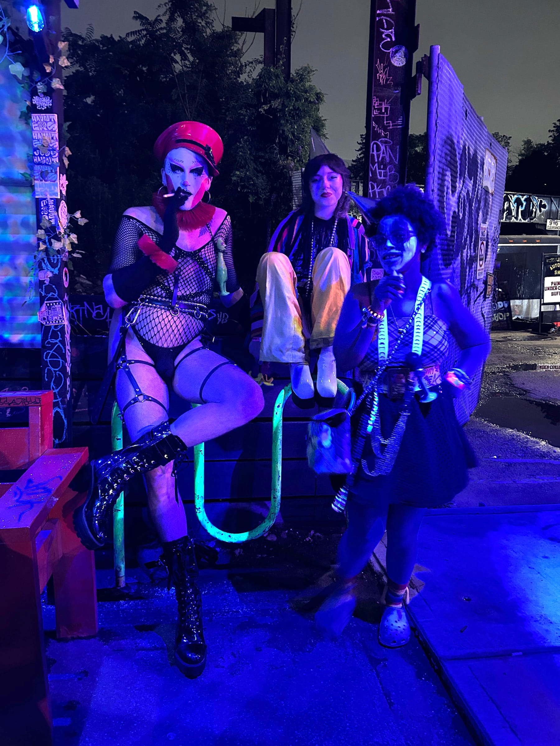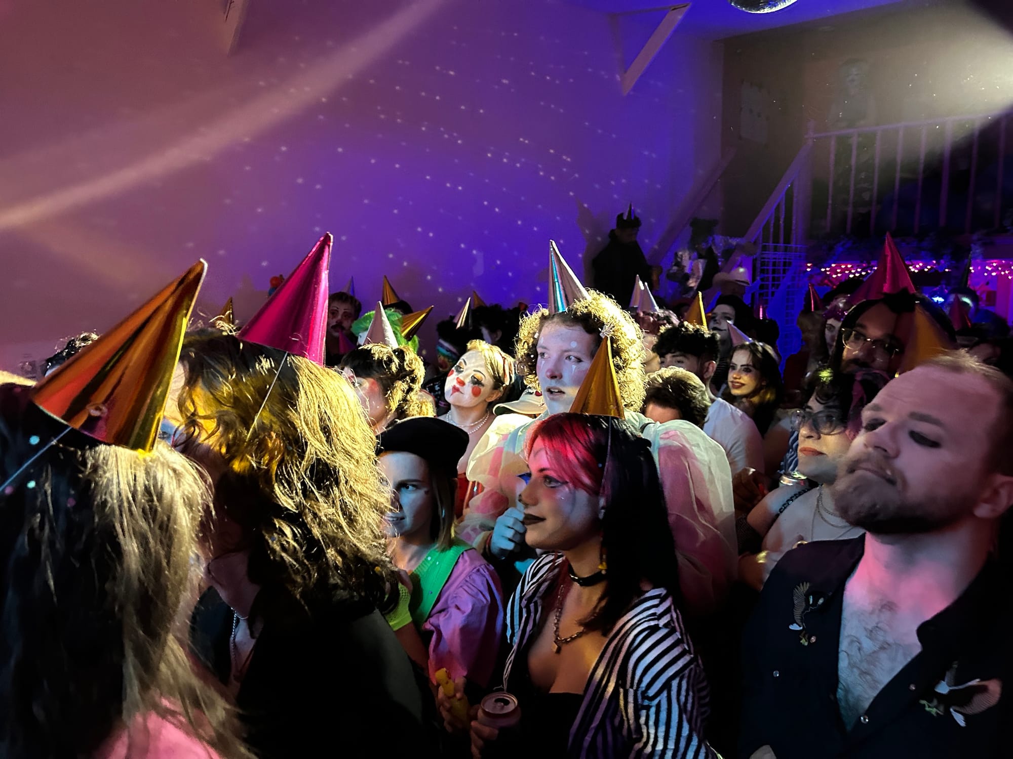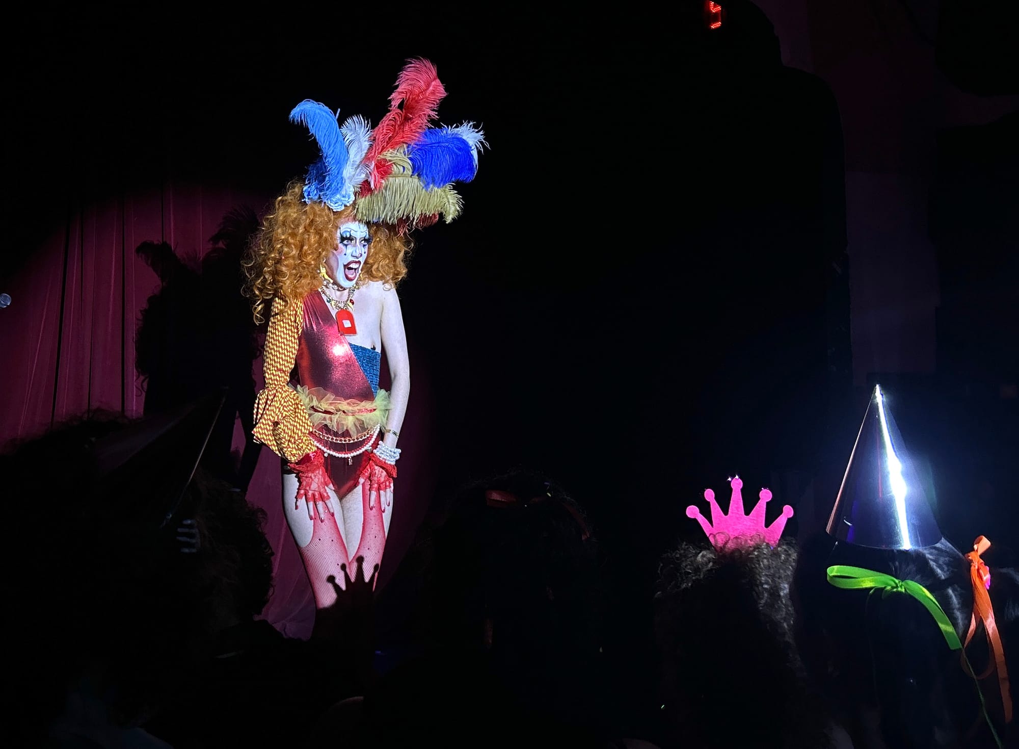 It was shortly after 8pm on Sunday, June 30, when I arrived at Purgatory, a queer owned-and-operated dive bar and music venue in Bushwick, Brooklyn. I put on my costume (a red foam nose) and found myself face-to-face with other similar, though more elaborately dressed, individuals wearing white face paint and drawn-on smiles. As I climbed up a narrow staircase bathed in red light, a towering clown in a thong fishnet suit and whiteout contact lenses descended past me, and at the top, I was greeted by a giddy clown with golden ram horns protruding from their head who handed me a party hat and a noisemaker.