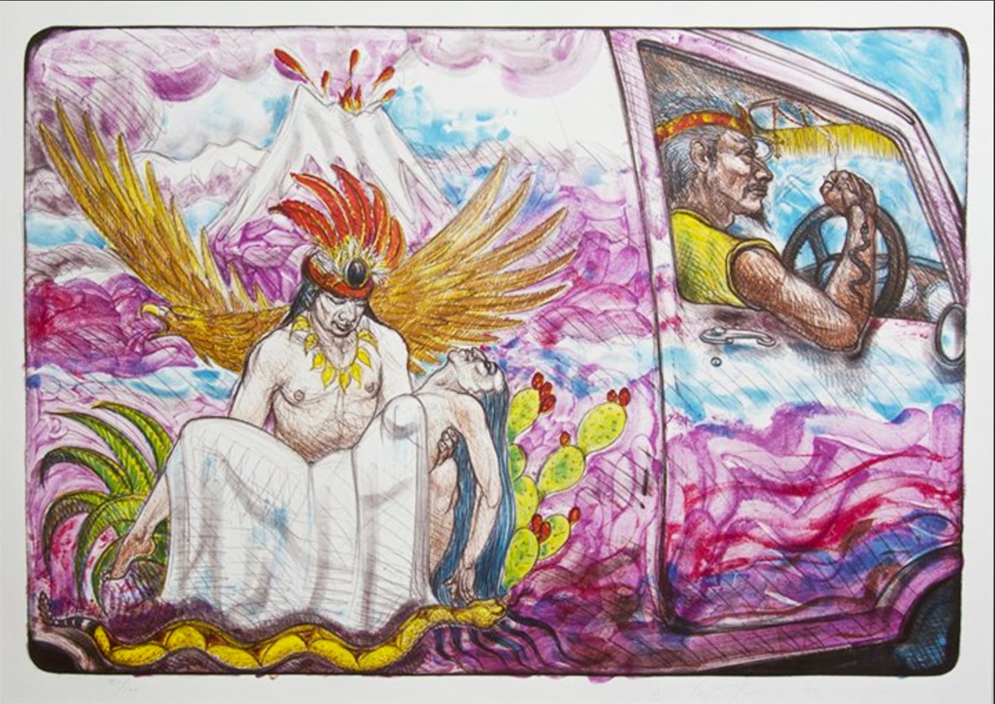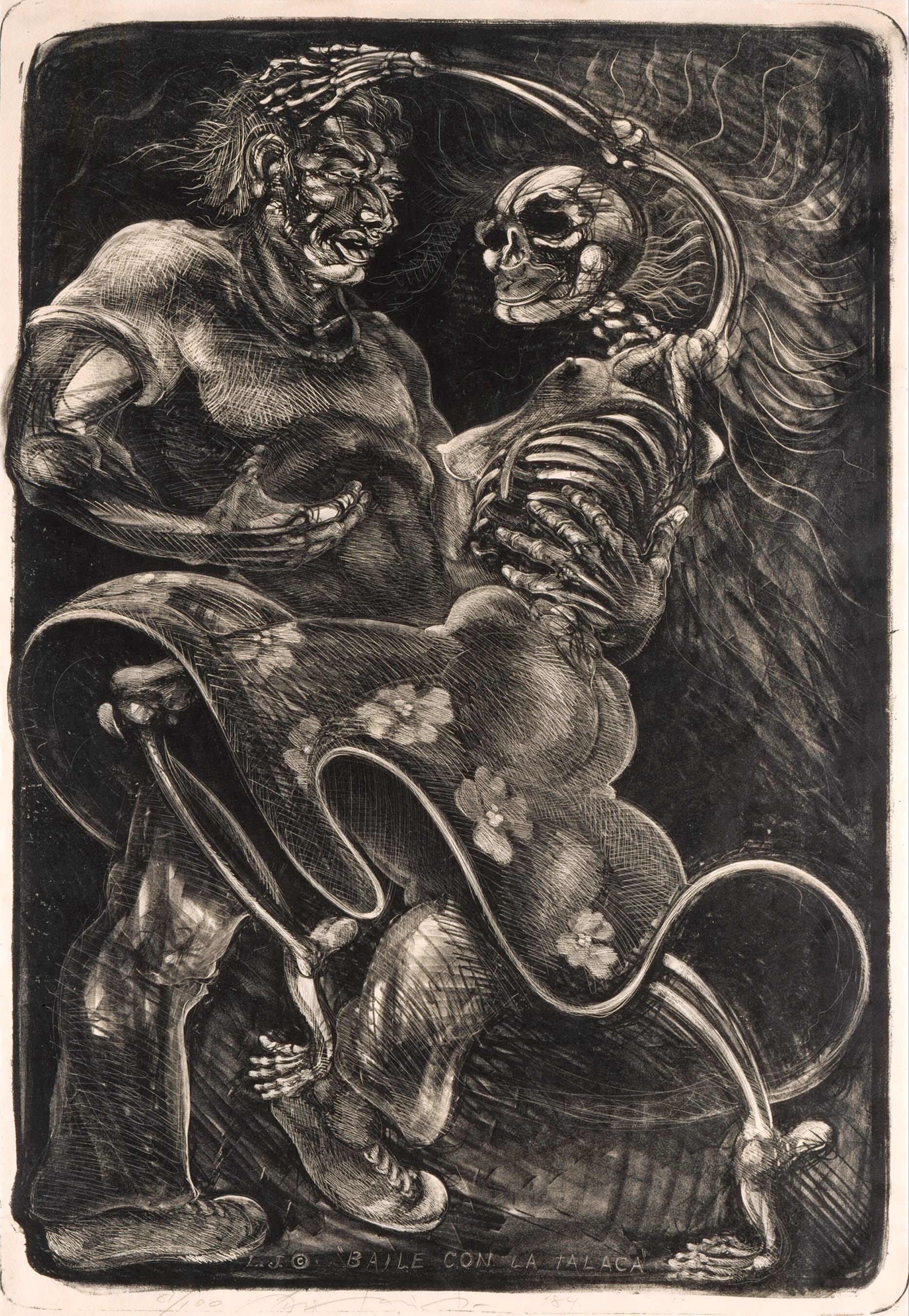 Indeed, Jiménez’s careful attention to human musculature, movement, and balance recalls the work of Rodin and Greek sculpture, and he was also a master draftsman. Dynamic drawings and prints record Jiménez’s uncanny ability to capture the figure in motion, but they also register his commitment to representing his community on its own terms. Jiménez’s 1997 lithograph “Cholo and Van with Popo and Ixta” fuses the worlds of everyday people with ancient myths. The van, driven by a man with a snake tattoo, displays a mural depicting the star-crossed lovers Popocatépetl and Ixtaccíhuatl, an iconic pair that appears in countless Mexican calendars and restaurant walls. In another lithograph, “Baile con la Talaca (Dance with Death)” (1984), the artist shows himself dancing with the Mexican embodiment of death, La Talaca (or Calaca), showing Jiménez’s close connection to his sense of mortality and ancestral culture.