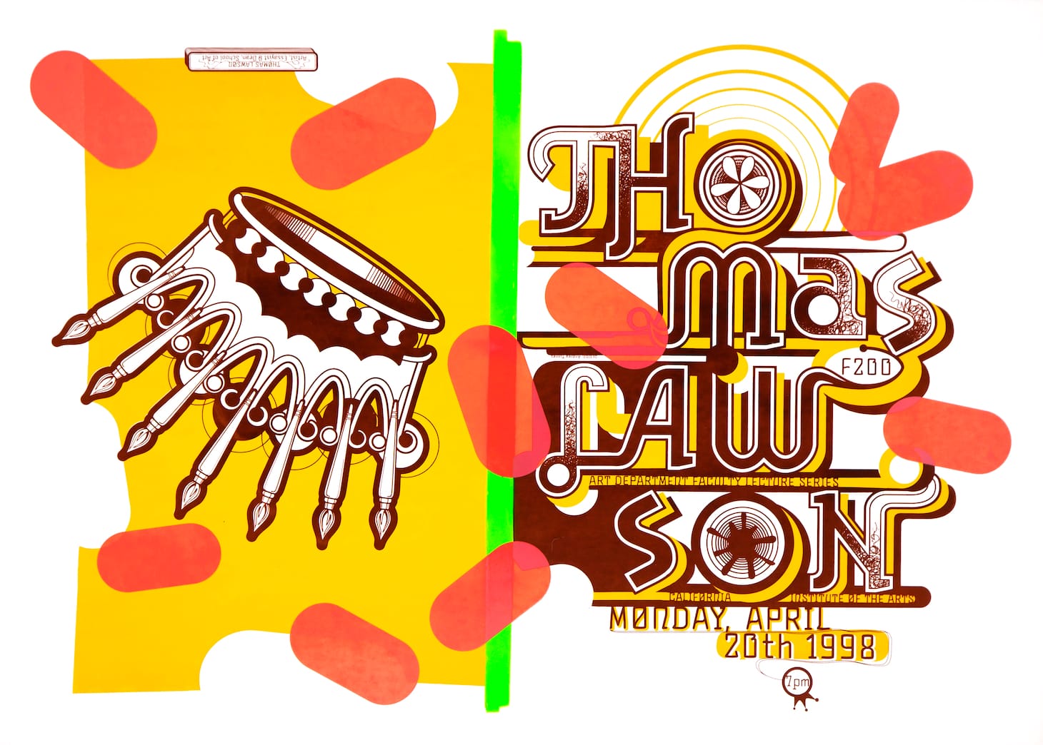 While Worthington has been the primary force behind this book’s publication, he was not the first to show an archival impulse towards collecting the school’s posters. Inside Out & Upside Down is, in many ways, a follow up to The CalArts 10th Year Poster Book, a 69-page book by Catherine Tuttle published in 1980 that documents the same subject matter from the university’s first 10 years. There was a lag in documentation until the late ’90s, when faculty members Shelley Step and Kary Arimoto started pulling posters from the hallways in the wake of substantive damage to the school from the 1994 Northridge Earthquake. Their collection, which Worthington has continued, grew over time, as people began donating posters and a process was set up for current students to archive their own.