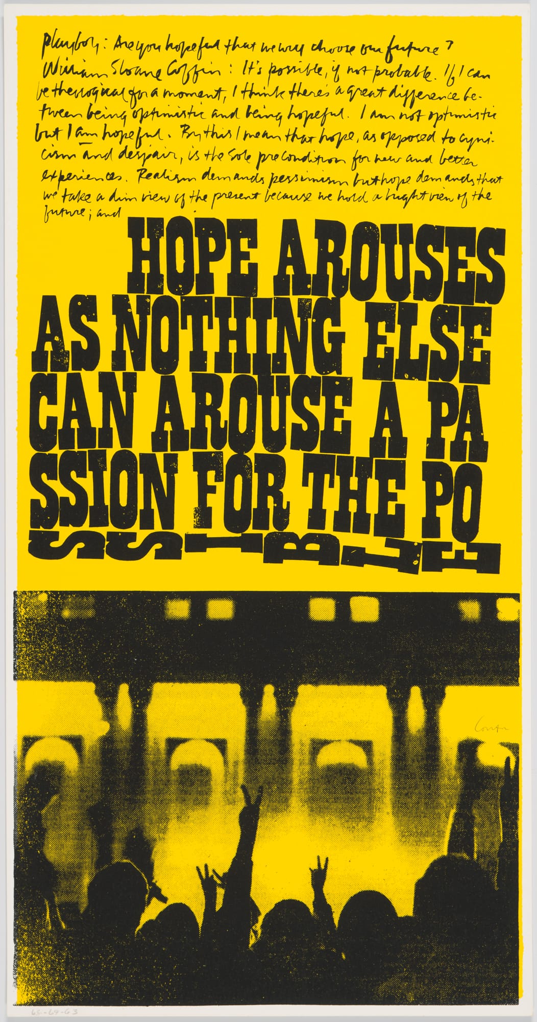 Born Frances Elizabeth Kent in 1918, Sister Mary Corita, as she would come to be known, joined the Immaculate Heart of Mary, an order of nuns in Hollywood, at the age of 18. She graduated from Immaculate Heart College in 1941 and began teaching art there in 1947. She soon began making screenprints, drawing imagery and text from consumer culture, magazines and newspapers, literature, religious sources, and contemporary music to create eye-catching and layered works.