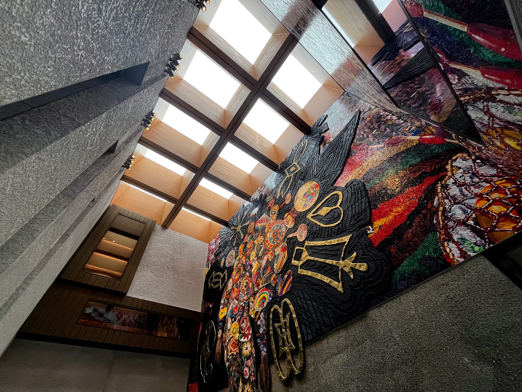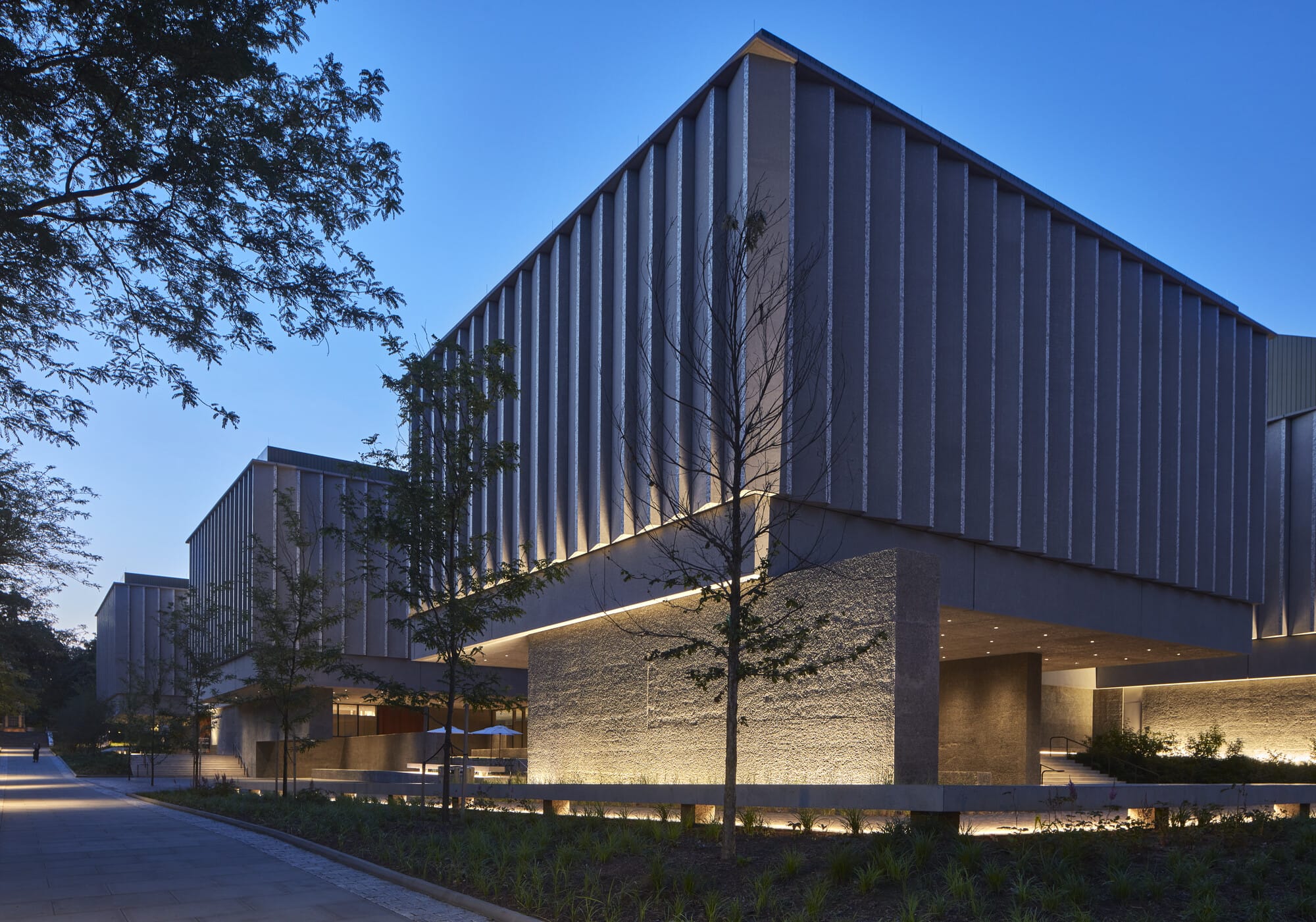 The result is a boxy, 146,000-square-foot compound in the Brutalist style, made of sand-blasted stone aggregate, bronze, and reclaimed laminated wood, that nevertheless blends in with the university’s collegiate Gothic campus. Several newly commissioned sculptures, including a large-scale Nick Cave mosaic on a wall near the main entrance, greet visitors as they approach.
