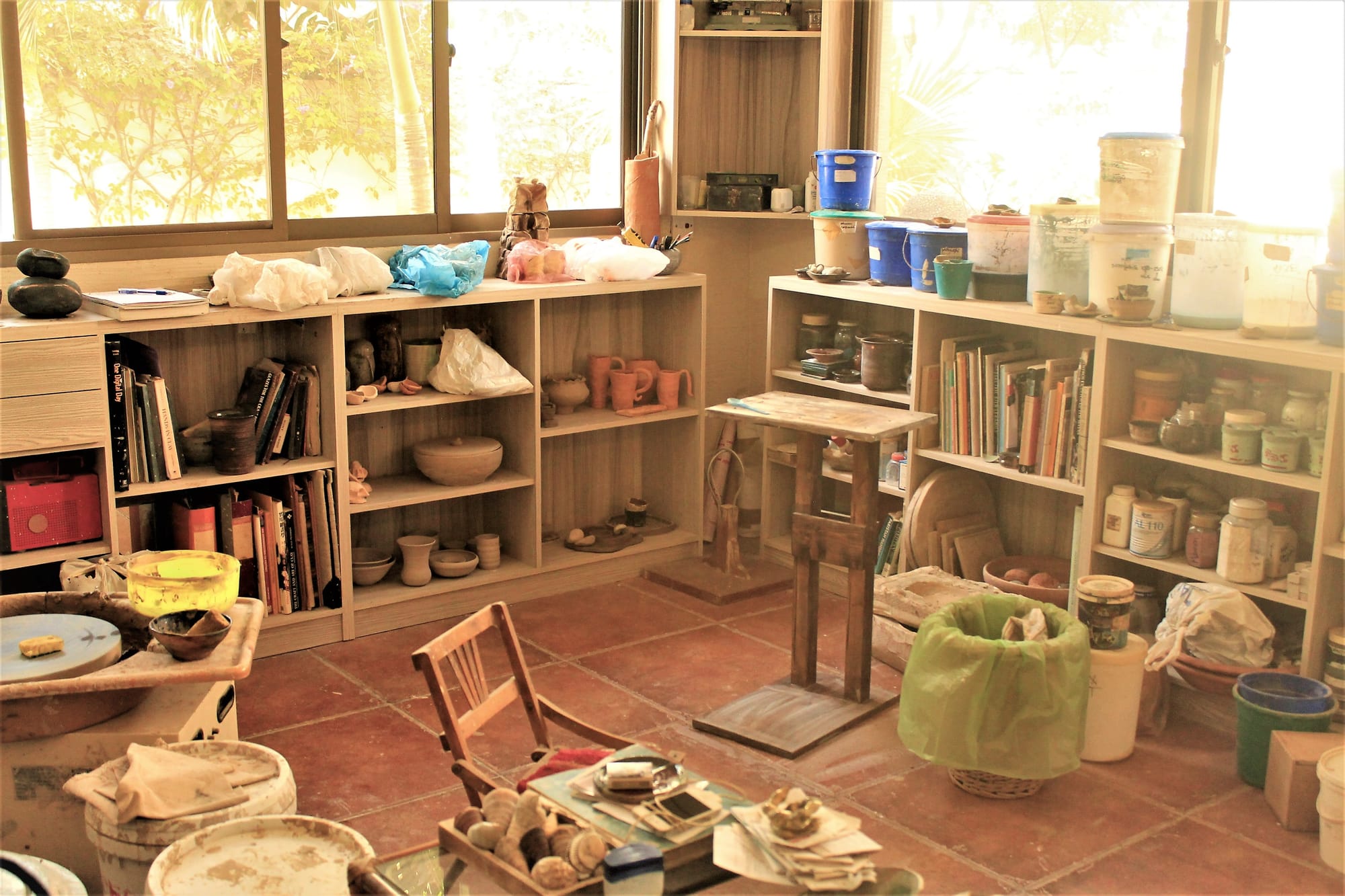 I started observing Shazia Zuberi’s ceramic practice a few years ago. With clay works and mixtures, tins of brushes, self-made glazes, a potter’s wheel, and books gathering dust, Zuberi’s average-sized indoor ceramic studio is a practical space. The room connects with a patio that acts like a personal exhibition gallery where the artist stores some works and semi-prepared clays. Another outdoor spot in her home stores her electric kiln. All these sections act as a composite space facilitating the transformation of ceramic into art for exhibitions or into functional pieces promoted via the artist’s pottery brand.