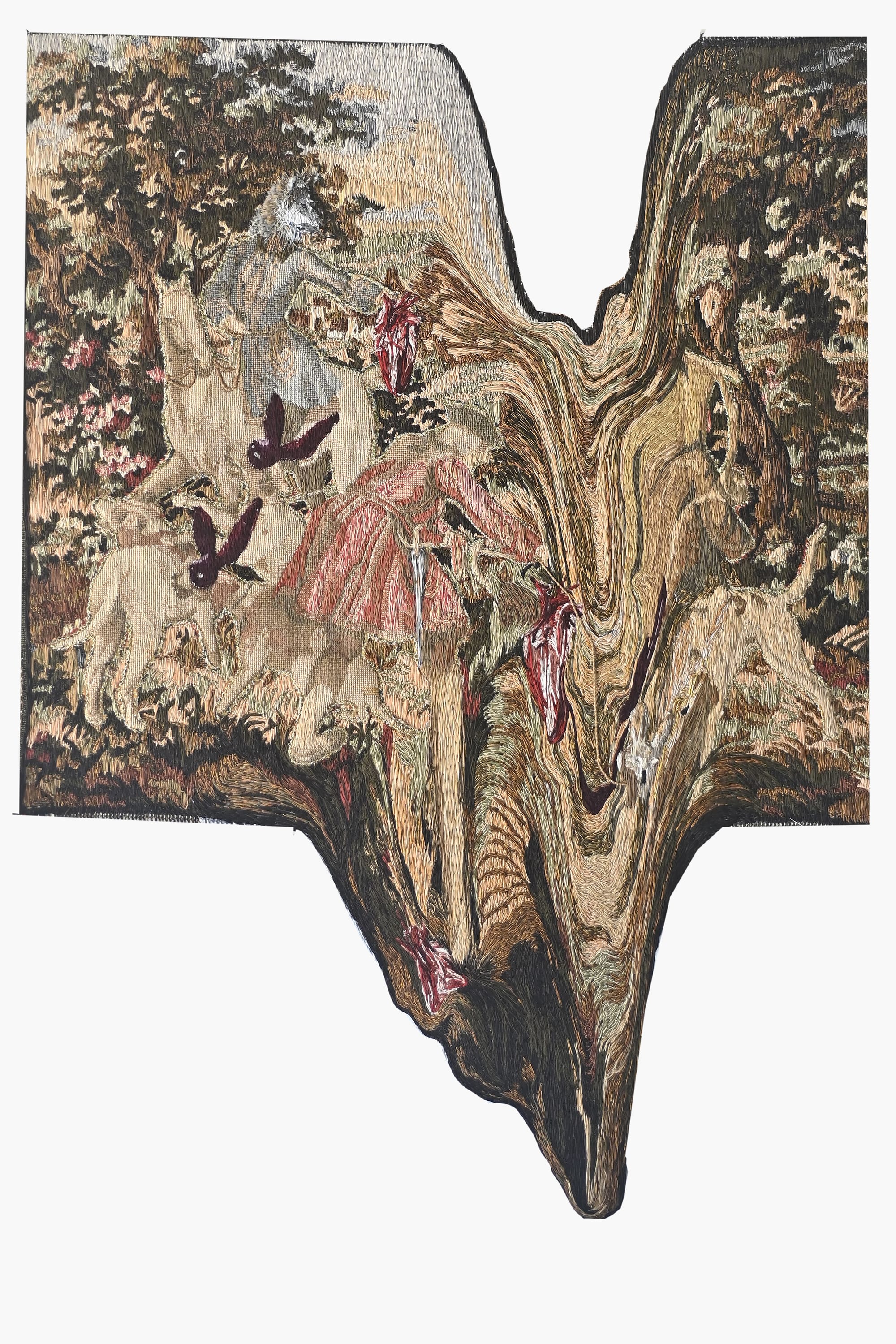 Marium Agha’s textile-based works center around ideas of love and desire through experiential realities of women. The artist finds tapestries in Karachi’s bazaars that often depict imagery of lovers’ rendezvous in the woods. She unsews their original threads, splashes inks over the surface, and then embroiders new strings in this semi-altered exterior using an ari (embroidery needle). The remodeled tapestries emerge with new meanings, its figures appearing to be “melting down” in the finished works. Agha applied these methods to create her piece “Hear Hear” (2021), which won the Public Vote Prize at the Sovereign Asian Art Prize in Hong Kong. “When I deconstruct something like this, I create an opportunity to rewrite the narrative,” the artist told me.