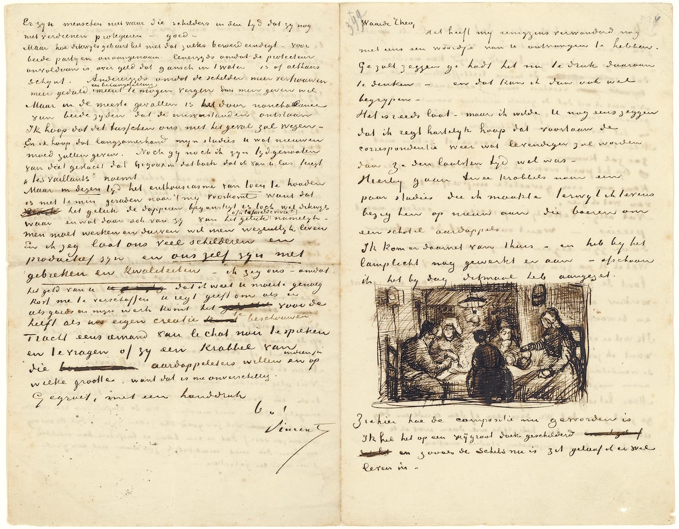 Vincent van Gogh, “Letter from Vincent van Gogh to Theo van Gogh with sketch of ‘The Potato Eaters,'” (Nuenen, Netherlands, April 9, 1885), pen and ink on paper, 20.7 x 26.4 cm, Van Gogh Museum, Amsterdam (Vincent van Gogh Foundation) Letter 492