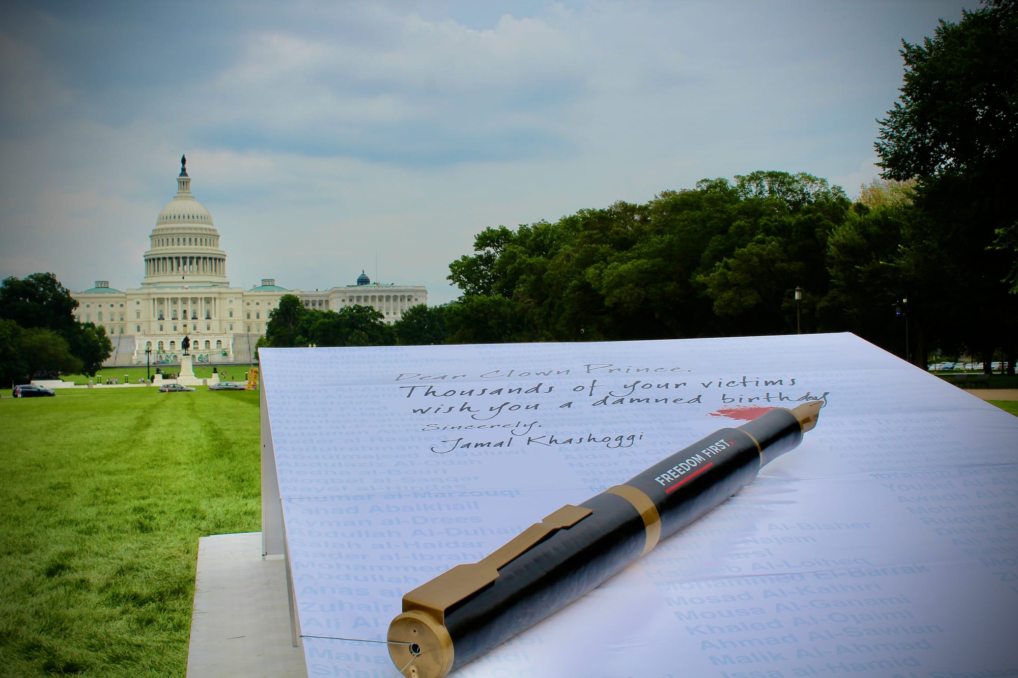The installation was on display from 12pm to 6pm yesterday at the National Mall. It featured a large-scale sculpture of a fountain pen bleeding red paint over a sheet of paper inscribed with the names of over 140 prisoners of conscience in Saudi Arabia, among them human rights activists Loujain al-Hathloul and Abdulrahman Al-Sadhan. A fictional message signed by Khashoggi, scrawled in black over the list of prisoners, reads: "Dear Clown Prince, thousands of your victims wish you a damned birthday."