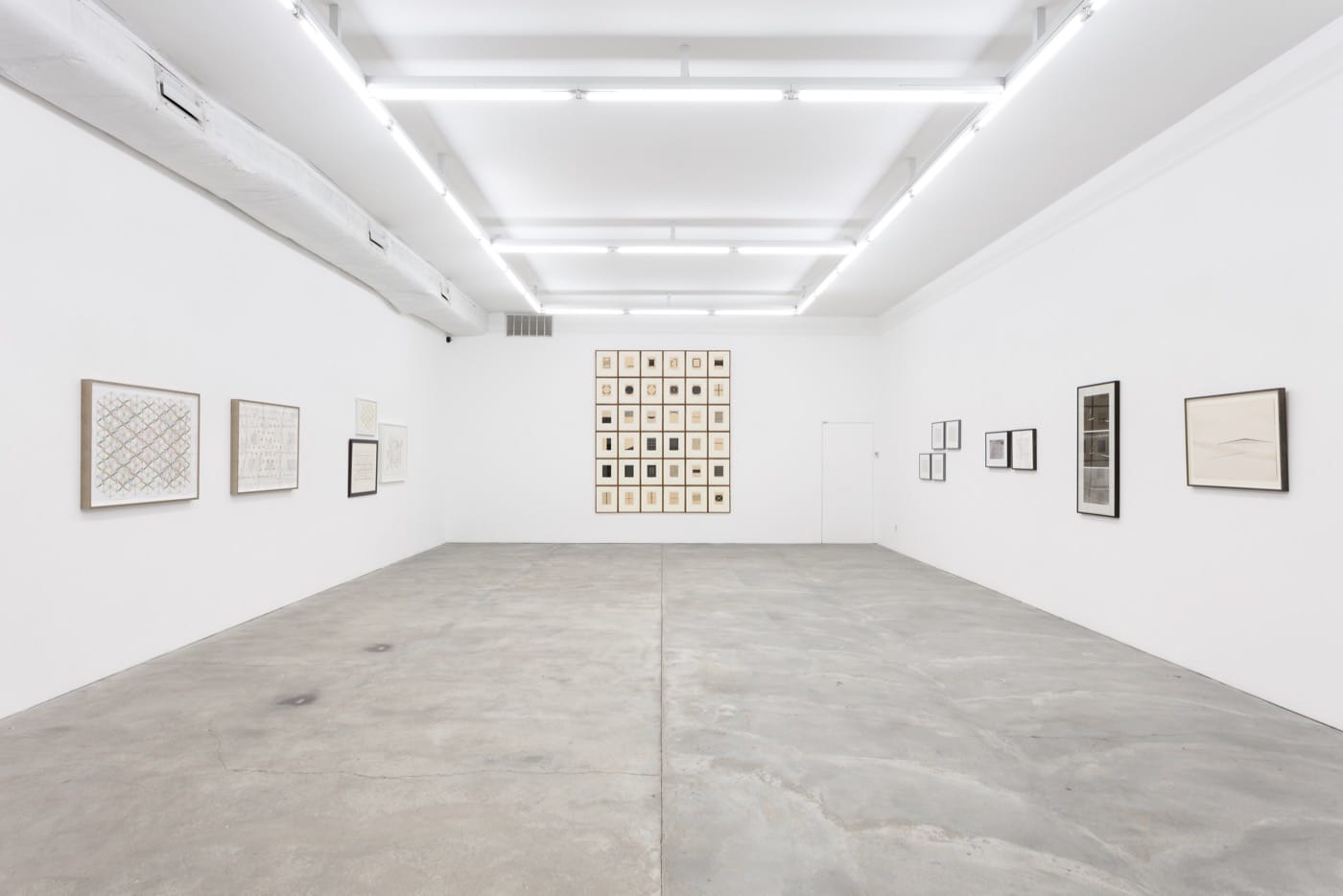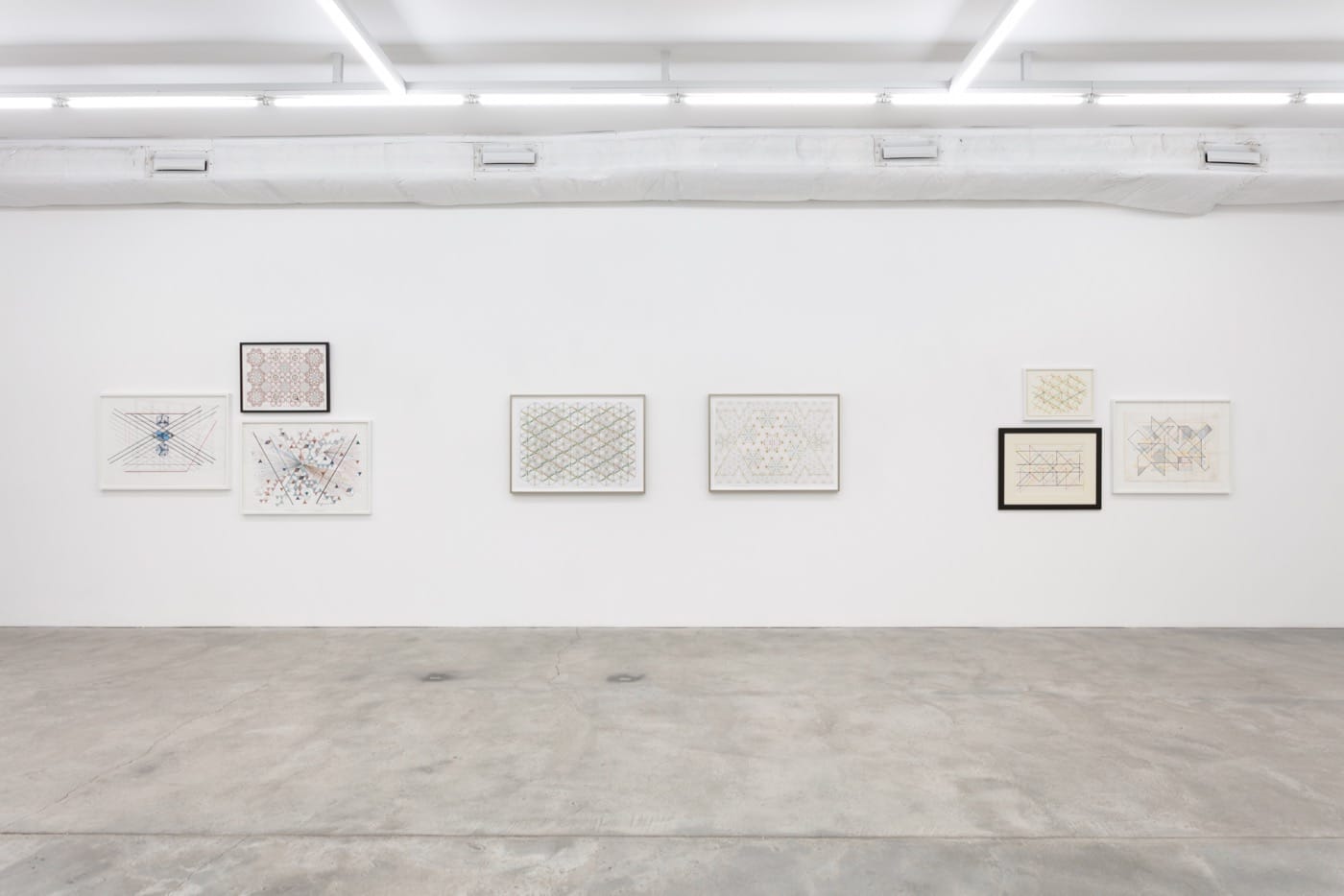Considering formal expression, the grid and geometric forms in this exhibition, one also starts to think about how these artists relate to figures outside of the paradigm of what is described as Arab and Islamic art today. Mohamedi’s grids, for instance, are often juxtaposed with Agnes Martin’s, and Farmafarmaian’s meditations on geometry with Frank Stella’s. It is worth bearing in mind that Arab and Islamic art of the past was just as worldly as it is today. During the medieval period, the hexagon form Farmafarmaian engages with travelled from medieval Iran to Turkey and South Asia.