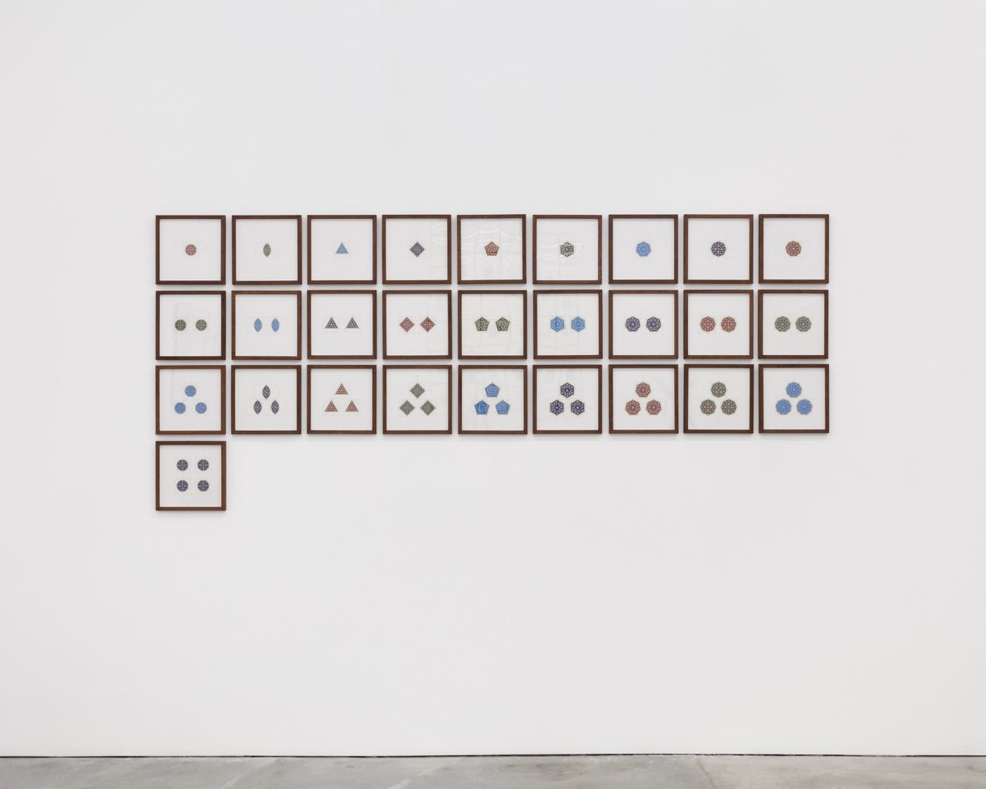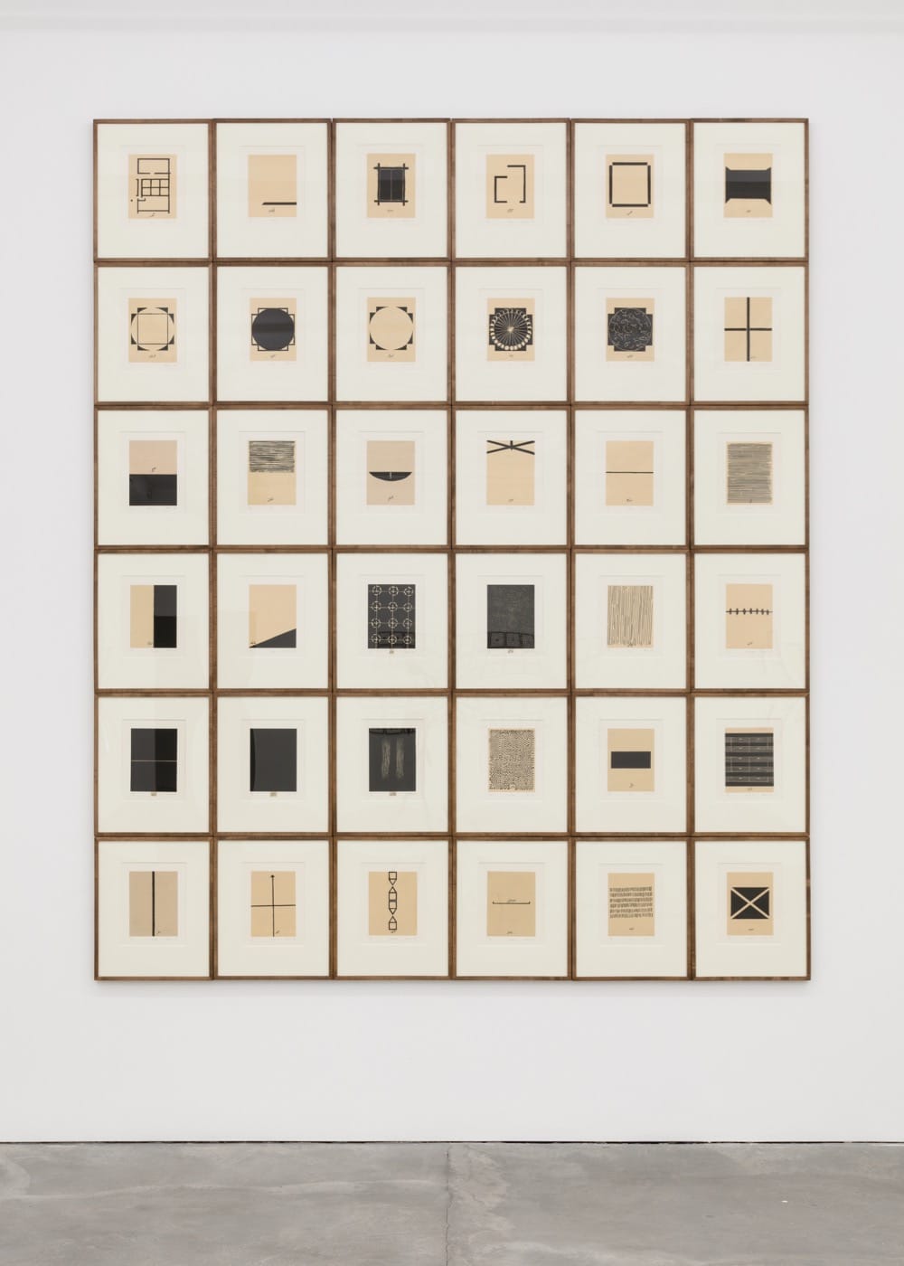 In relation to each other, we can see how they come into a dialogue over the issue of form — especially as they engage with geometry, line, and architecture. Awartani’s contemporary adaptation of the practice of assigning each Arabic letter with a particular numerical value in her “Abjad Hawad Series” (2016), for instance, comes into dialogue with Farmanfarmaian’s much earlier “Variations on a Hexagon” (1976) that consists of foundational patterning techniques in Persian design. The intense control needed to execute the lines in each of Mohamedi’s works are central to the processes of Awartani and Farmanfarmaian’s practice. And Zarina’s practice of printmaking, and particularly her intimate engagement with the materiality of paper, allows her to work with the same set of concerns of geometry and space, but in a completely different medium.