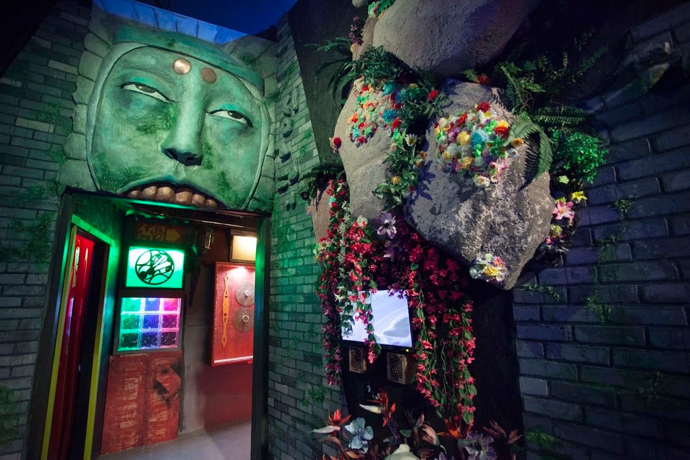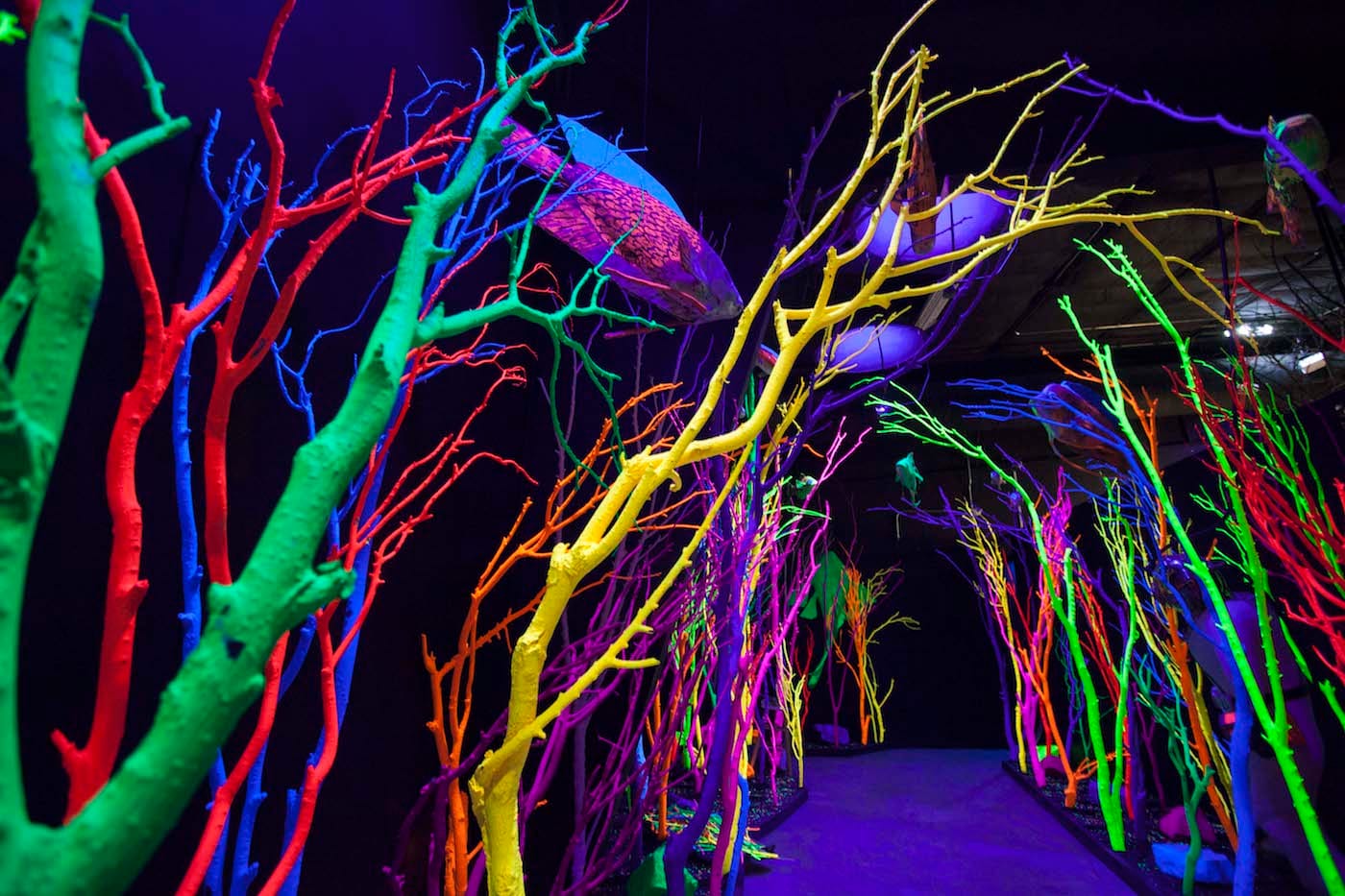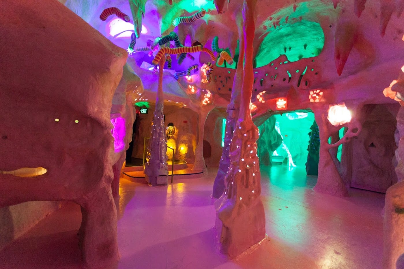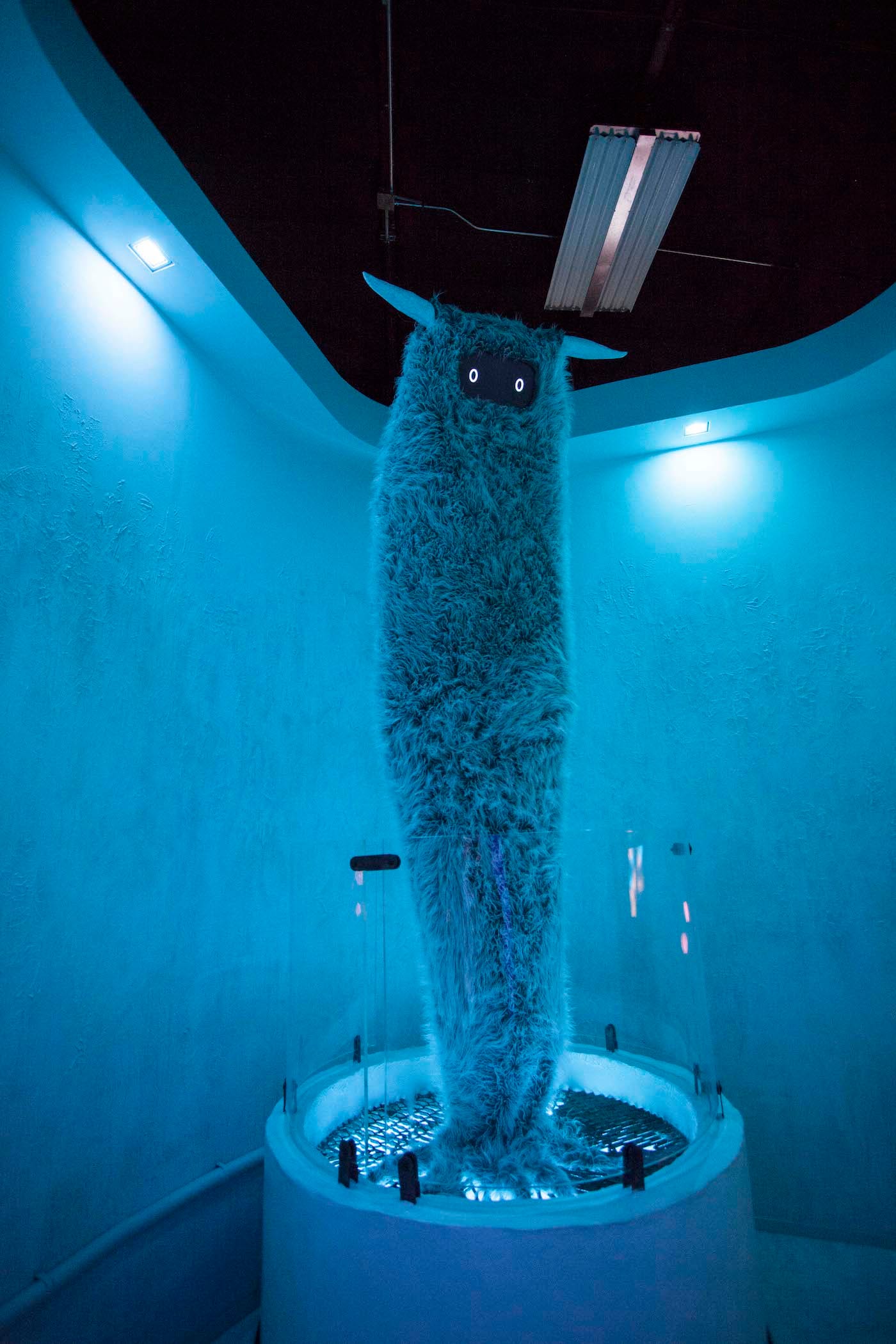 At the House of Eternal Return, I saw the ticket line stretching out the door toward the giant metal sculptures of a wolf and a robot smelling a flower in the parking lot. Inside, the installation opens in a Scooby Doo–ish Victorian house, where a vaguely described mystery involving a missing family has unlocked supernatural portals into other worlds. The theme is a very loose construct that ultimately fails to contain the chaos within the wondrous maze of rooms filled with a bizarre bounty of surprises. A 20-foot-tall furry, horned creature stares down with hollow glowing eyes, a video projection of a falling man can only be glimpsed inside a toilet, and a path winds through a forest of neon glowing trees. I walked into a mastodon skeleton’s eerie green rib cage and played its bones like a xylophone. Try doing that at MoMA.