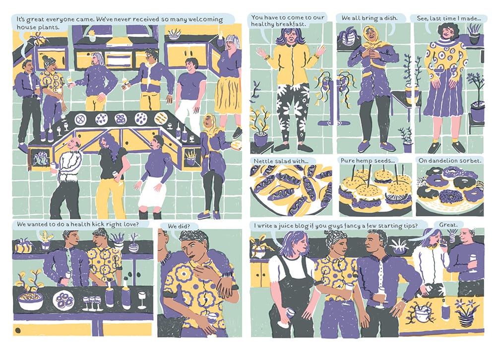 Hip parents develop artisanal party menus in “UpperHaven Squaresville,” the first of the interconnected stories in Something City. Its title page sets the course for how each comic is introduced: Big, stencil-like type calls out the wealthy enclave for which this chapter is named. Below the blocky letters, characters with a broad range of body shapes and skin tones attend to purple and butterscotch-golden plants in the single panel’s backyard gardens. Squared-off bluish green lawns contrast sharply with the artist’s network of showy geometrical shapes and unlikely color pairings. Drafted in comical disproportion to the architectural structures around them, long-limbed neighbors lean ladders against homes topped with imperfect rows of purple and black roof slats. Inside the houses, Weaver’s spindly figures move around blotty tabletops, each free of pesky contour lines. Working in what she described to Pipedream Comics as a process similar to screenprinting, the illustrator lends a pronounced visual texture to her drawings. It’s as if we’re thumbing quilted patterns in order to better examine the stitch work.