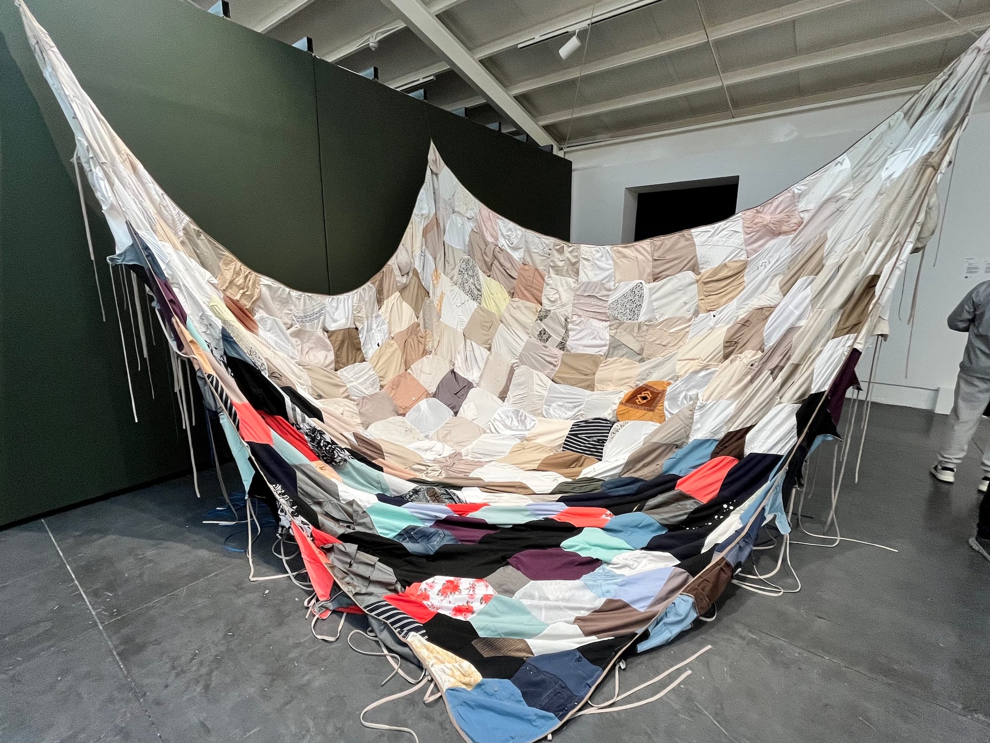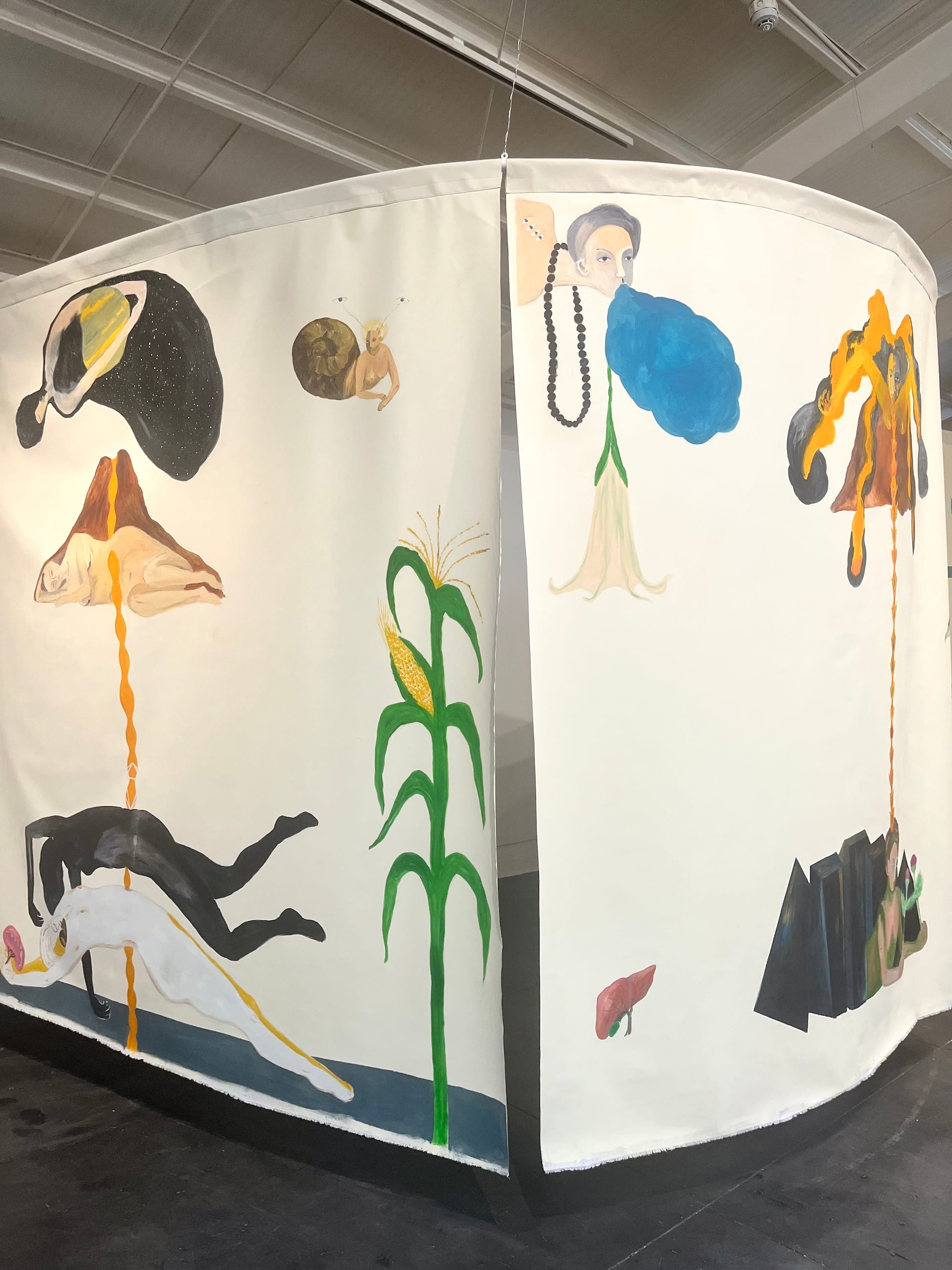 Moving on to the art at La Nueva Fabrica, I saw a number of strong installations, among them Patricia Belli’s “Multitudes” (2025), a suspended quilt composed of used clothing and lace. Belli assembles remnants of found materials in her work about destruction and repair, creating a new form to grant the material a second life. Another textile work, Luz Lizarazo's newly commissioned mural “Wander” (2025), which winds through the gallery, depicts animals and plants interspersed between representations of the earth and sky realms. Balam Soto addressed Mayan mythology directly with “Kukulkan: An Immersive Mythological Journey” (2025), a wall and floor video installation employing data interactivity and extended reality to translate the myth of the Mayan serpent deity into poetry and sensory language.