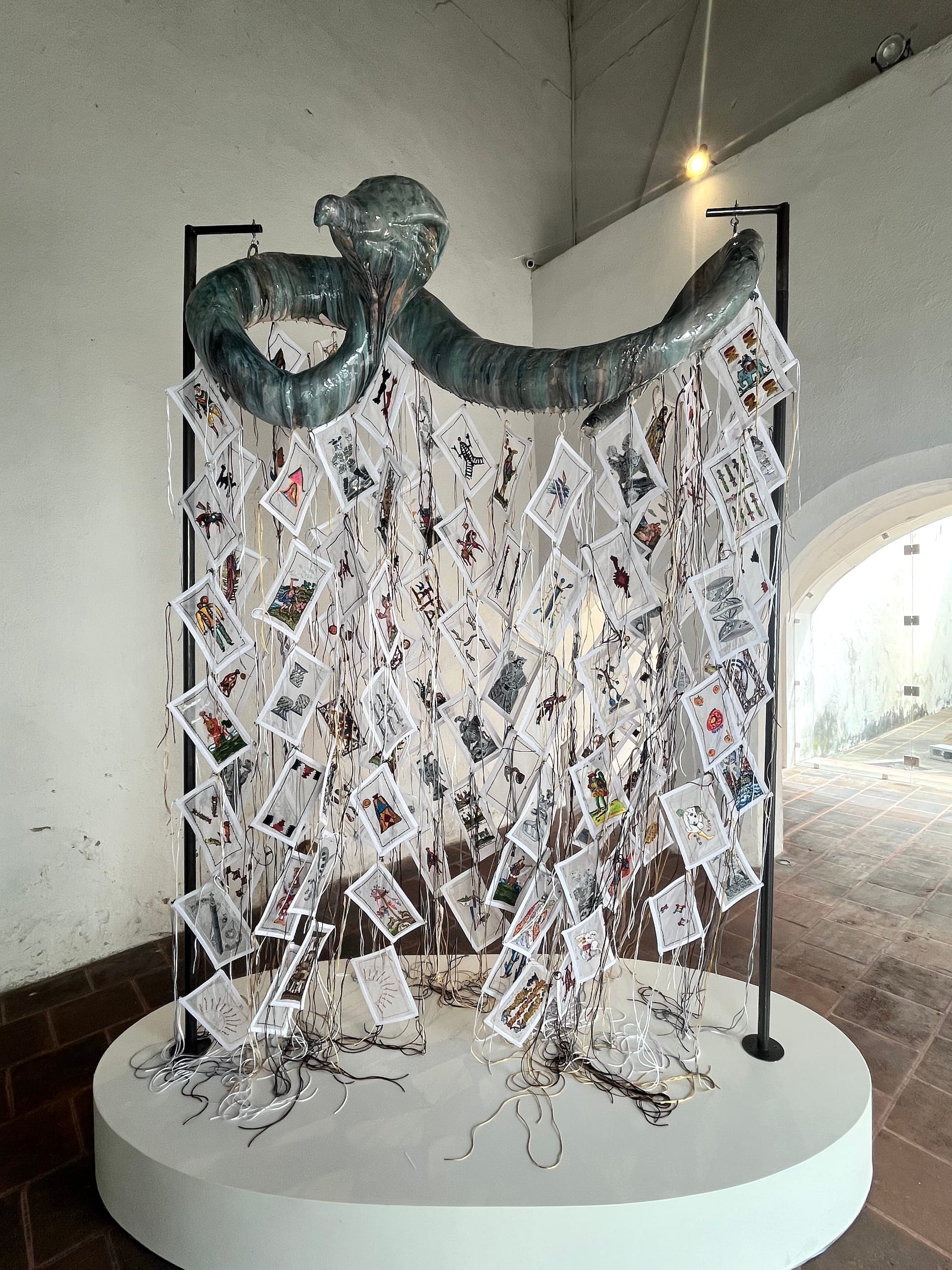 A short walk led us to the National Museum of Guatemalan Art (MUNAG), whose elaborate installations included Naufus Ramírez-Figueroa’s “From Spiral to Spiral,” a series of embroidered playing cards or “naipes” suspended from a large ceramic snake. The work merges the artist’s family lineage with European colonial history: While the women in his family used these cards for divination, they were a key income source for the Spanish Monarchy, the making of which was tightly controlled by the Crown, seeking to eradicate forgery and its use in gambling. Voluspa Jarpa’s “Extinction,” floor to ceiling tridimensional maps from her series Cartografías de la Sindemia, combines territorial maps, graphics, archival materials, and data sets to show that territorial memory is far more complex than historical memory, and that geopolitical boundaries are not as sharp as they appear on maps.