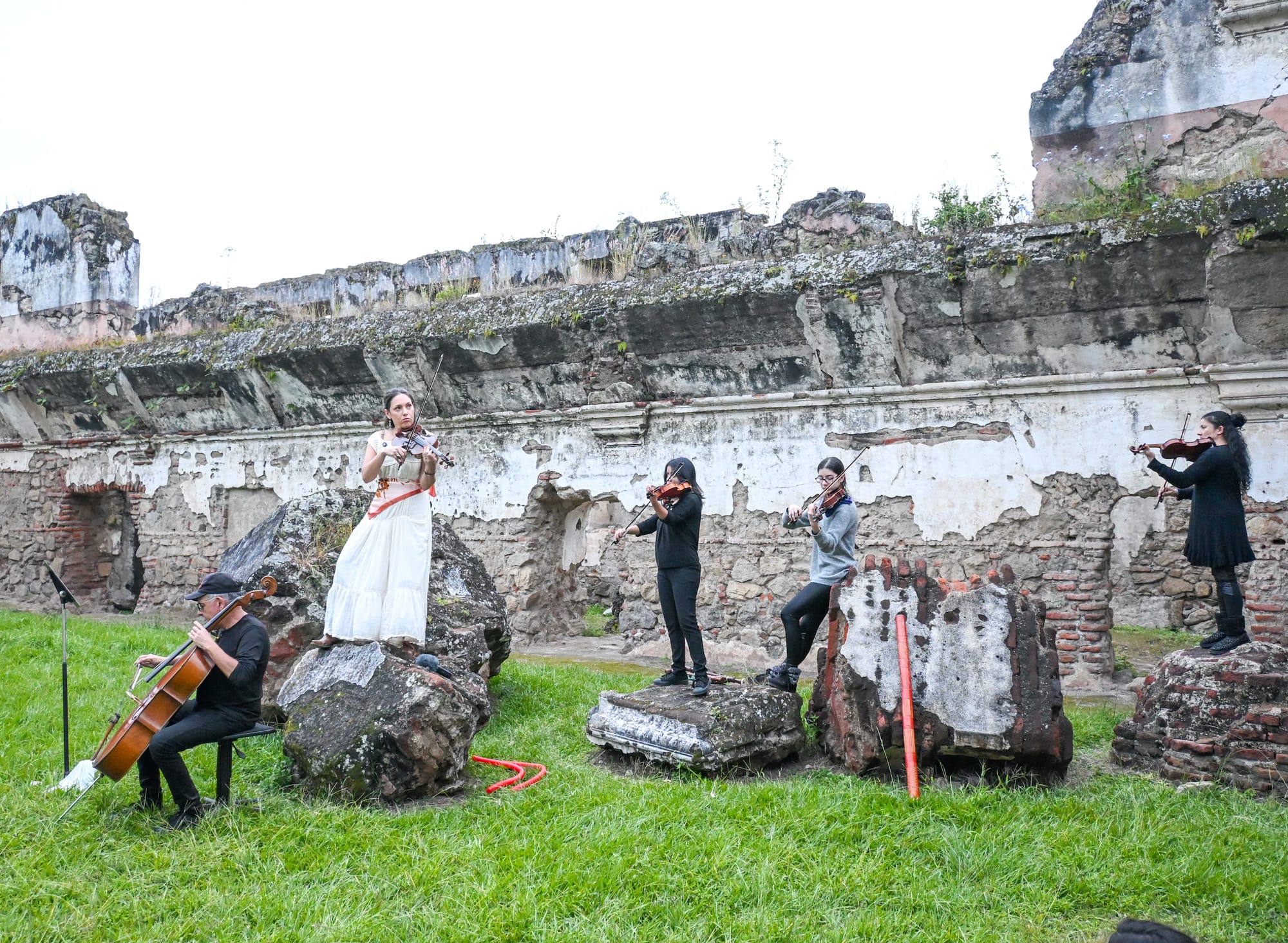 At the Centro de Formación de Cooperación Española, Antonio Pichillà incorporates the ritual of dance with the image of a stone to reconnect with Mother Nature: “Dancing with a Stone” offers insight into the syncretism practiced in Guatemala today. We arrived at the Convento La Recolección as the sun was setting; there, amid the ruins, Igor Grubić planted trees and Kite conducted violinists, performing dreams that were translated into scores.