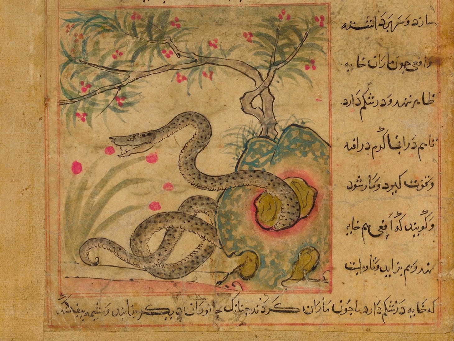 The curated manuscripts and objects in Book of Beasts are luscious reminders of the late antique and then medieval use of animal symbolism across the Mediterranean as a recognizable visual language within early Christianity. However, the understanding of animals and their use in medicine or healing is also apparent in other illuminated manuscripts from outside Western Europe within the exhibition, such as an illumination of a viper from a Persian copy of Ibn Bakhtishu’s Manafi al-Hayawan (“On the Usefulness of Animals”).