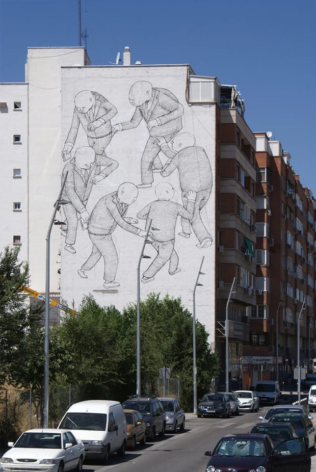 The “Oficina de Gestion de Muros” (Walls Management Office) is an independent Spanish project that wants to fill the empty spaces around the city of Madrid with art. It was at an art event “La Noche En Blanco, 2010” in Madrid that the Walls Management Office announced their intentions to put the best street artists on the planet in touch with Madrid locals, neighbors, shopkeepers, and businesses who had walls waiting to be painted.