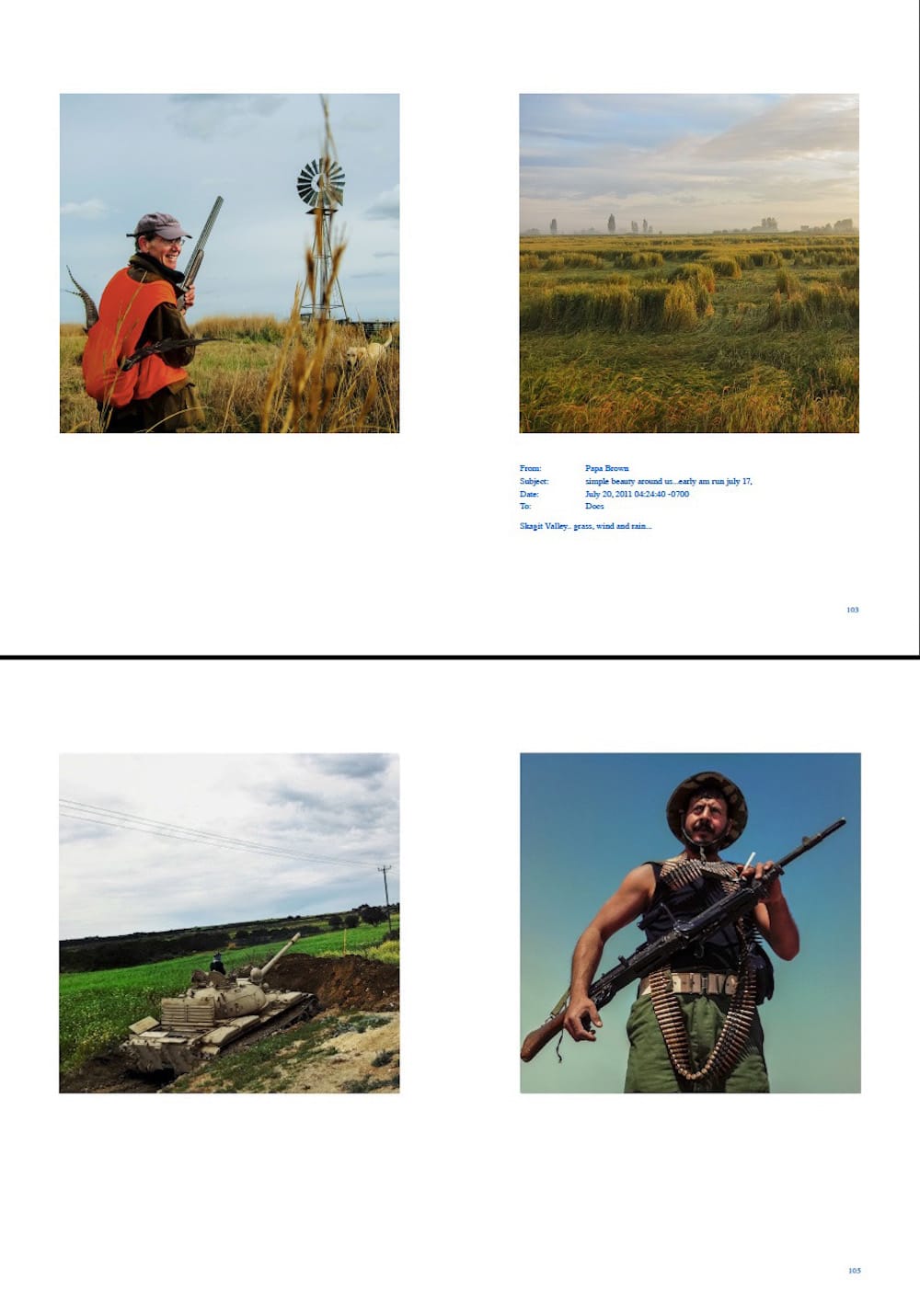 LW: Partway into the book you create what I think of as a “visual chiasmus,” a repetition, in reversed order, of imagery. One page spread: your dad, wearing a baseball cap and holding a rifle for hunting (left page) alongside the soothing, grassy landscape of Skagit Valley, WA, the place where you’re from (right page). Next page spread: a tank, cutting up the otherwise green, grassy landscape on the outskirts of Al-Marj, near to Benghazi (left) alongside a male fighter, wearing a camouflage hat, draped in ammunition belts, holding a light machine gun (right). Why craft this visual parallelism?