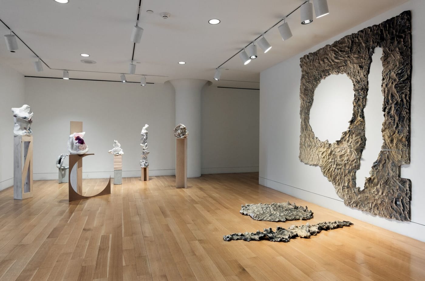 Brie Ruais’s work emphasizes the corporeality of the body while highlighting the value and presence of human labor. Ruais begins most of her pieces with a mass of clay equivalent to her body weight, and then uses her body to shape the clay into large ceramic sculptures. Her two works in the exhibition, “Spreading and Tearing Away from Center” (2018) and “Double Unzipped” (2015), both large-scale, came in several separate pieces and each required eight hours of installation time. Both pieces bear the deep marks of the artist’s arms, hands, and shoes. In this sense, they operate like archeological evidence from time past.