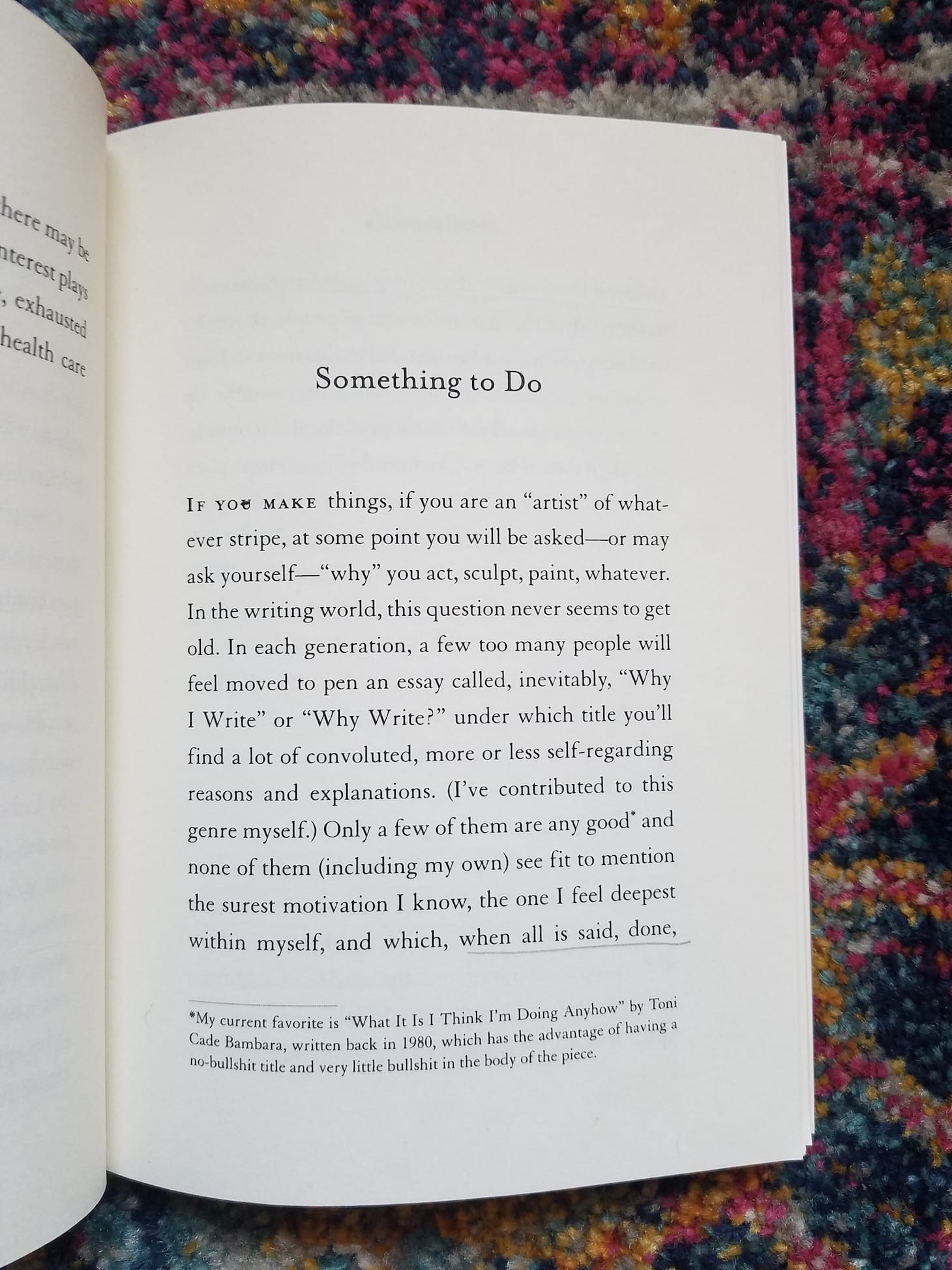 Unencumbered with busyness and schedules, unceremoniously granted free time to do as she pleases, Smith finds herself at a loss over what to do, exactly. Writing, she explains in her essay “Something To Do,” is no different from baking or sewing or gardening. All these activities try to mold time into something recognizable. In their particular ways, they are all monuments to productivity. In the early days of lockdown, Smith thought she would distract herself in the “playpen” of creation, but instead she uncovered her spectacular need for routine: “I found out how much of my old life was about hiding from life,” in the form of arbitrary limits and deadlines. And now “this crisis” has forced her to sit with the compulsion towards doing. What happens if time isn’t filled by capitalistic pressures? Smith blames her puritan upbringing, but she doesn’t linger on the revolutionary possibilities of rest and refusal. “Do we know how to stop?” She asks provocatively before speeding on to her next glittering thought.
