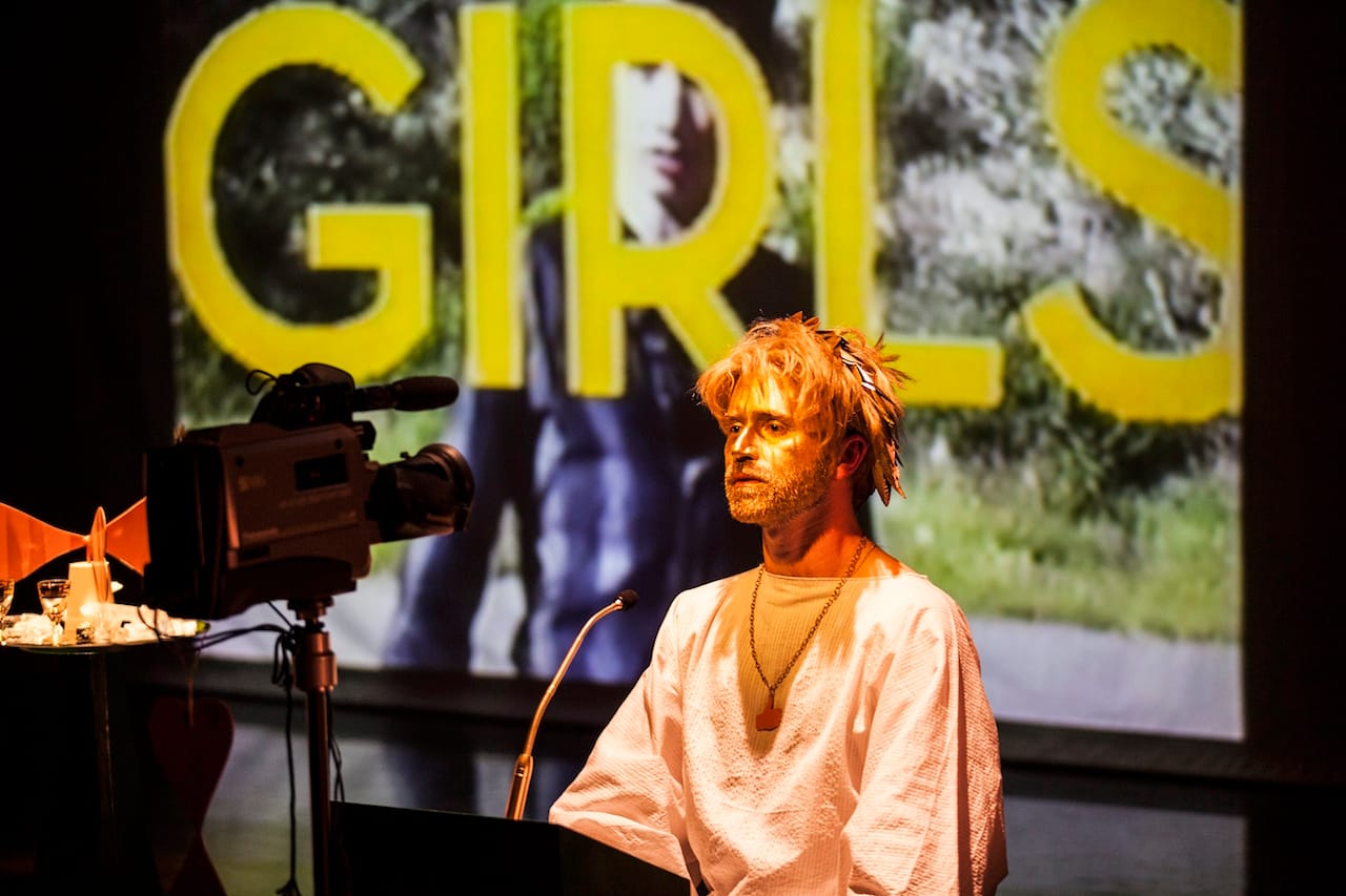 With its use of a repellant antihero, Confirmation resembled The Art of Luv (Part 1): Elliot at the Public Theater’s Under the Radar Festival. Royal Osiris Karaoke Ensemble, like Chavkin and Thorne, turns to a bigot for its story. Though the piece has many modules, the central thread concerns Elliot Rodger, who went on a shooting spree at his California college in 2014 because he felt rejected by women. The piece includes videos that Rodger, deluded and pitiful, posted before the killings, in which he, the supreme narcissist, insists on how “magnificent” he is and wonders how women could turn him down. As with the other sampled video in the show, Royal Osiris Karaoke Ensemble lip-syncs Rodger’s video monologue and then gradually actually speaks his words as Rodger’s voice is muted. Duplicate video streams of the lip-syncing performer are projected overhead on either side of Rodger’s video, as in an oversized triptych.