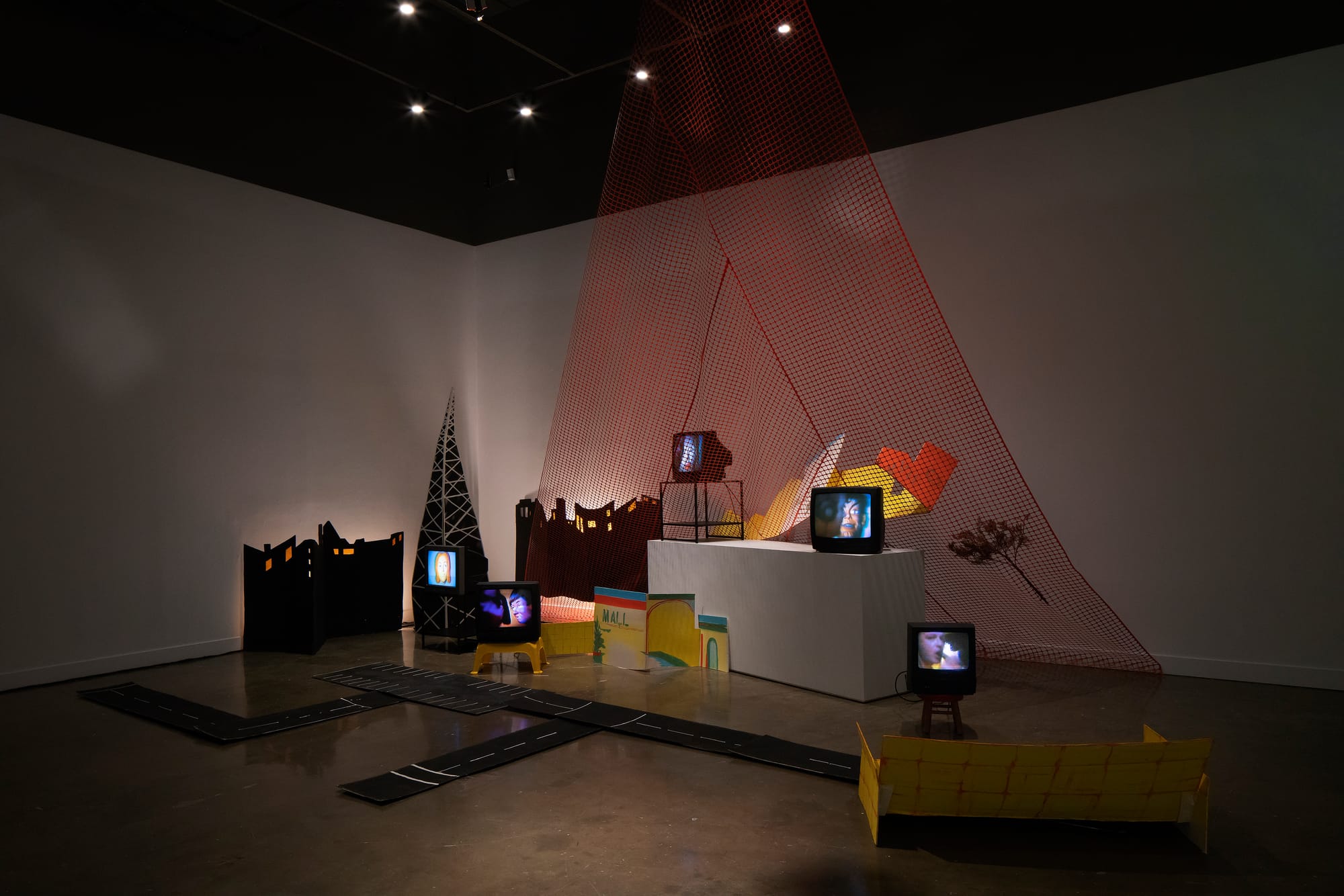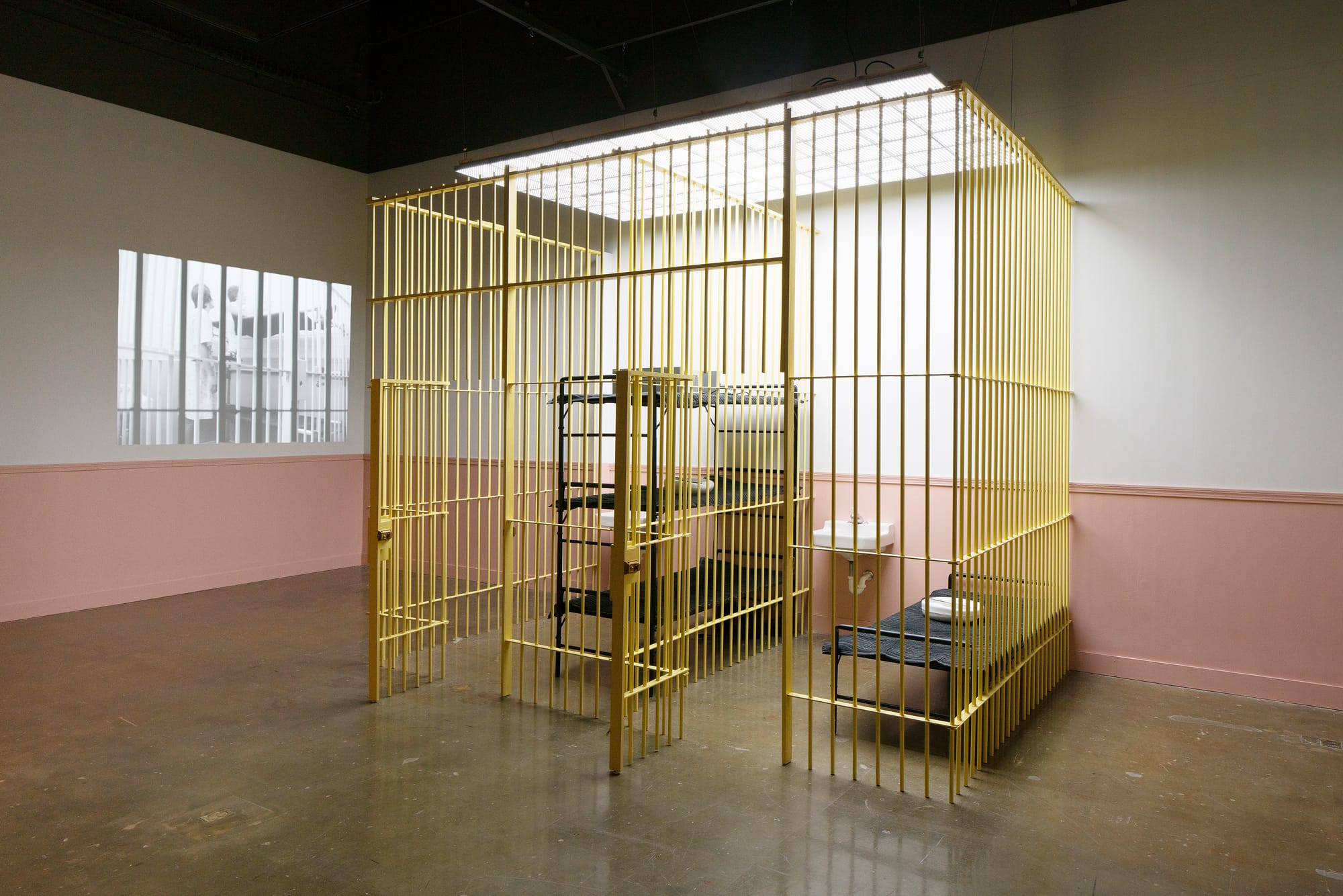 These are obscure pieces in Conrad’s oeuvre. Better-known works in the exhibition include some pieces from the incredibly elegant conceptual series, Yellow Movies, a group of minimalist paintings in the medium of emulsion, intended as very long-form films, “playing” for 50+/- years, that he produced between 1972-3. MIT is also projecting his film/installation, “WiP (Women in Prison).” WiP’s footage, shot in 1982, features artists Mike Kelley, Tony Oursler, and Joe Gibbons. Conrad went so far as to buy the building the set was installed in during what turned out to be a 30-year hiatus in completing the improvised piece. Due to Kelley’s untimely death in 2012, the film was never finished as planned, but excerpts were edited together for an exhibition in 2013, and shown in tandem with his hand-built prison cells. As with “Yellow Movies,” “WiP”’s merging of experimental filmmaking and performance art and demonstrates Conrad’s eternal questioning of the boundaries of a given medium.