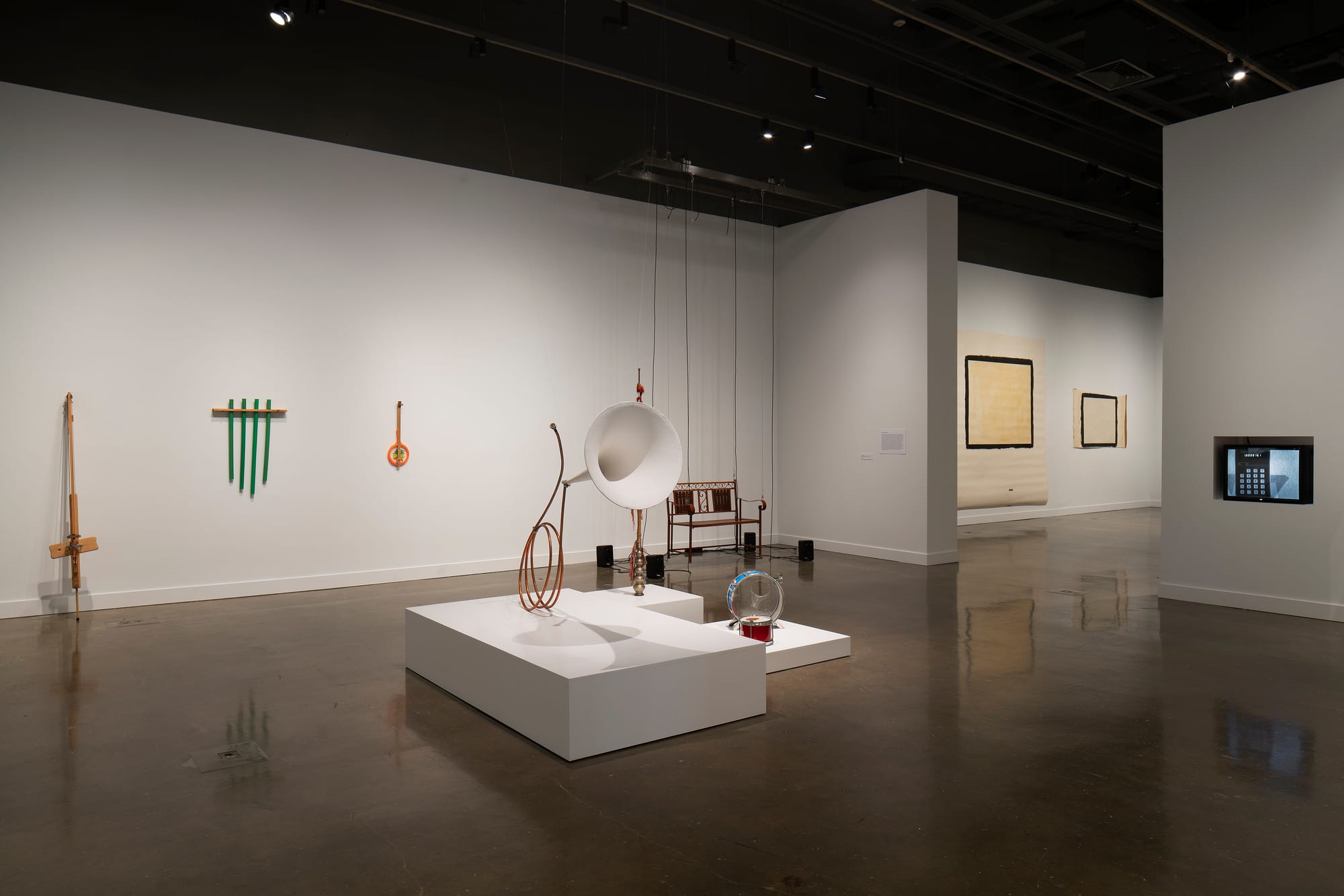 The larger part of the exhibition is displayed at MIT’s Hayden and Reference Galleries, which feature his musical, film, video, and conceptual projects. (An example of the last is “H,” from 1965, which consists of 60 pages of IBM computer printouts of the letter H.) Several of Conrad’s handmade instruments, effects pedals, and compositional projects are showcased in the largest gallery and range from extremely silly to esoteric. Math plays a big role in two compositions from the late 1970s. “Pi” (1978) experiments with generating music through the ratio of circumference to diameter in a circle, in part to question our dogged adherence to more traditional Western composing methods (frankly, the musical result is more entertaining than pleasant to listen to). “Cycles of 3s and 7s” (1977) is Conrad’s first video piece, but is also “music” — it’s him speaking and typing a repeating and shifting pattern of 3s and 7s into a pocket calculator.