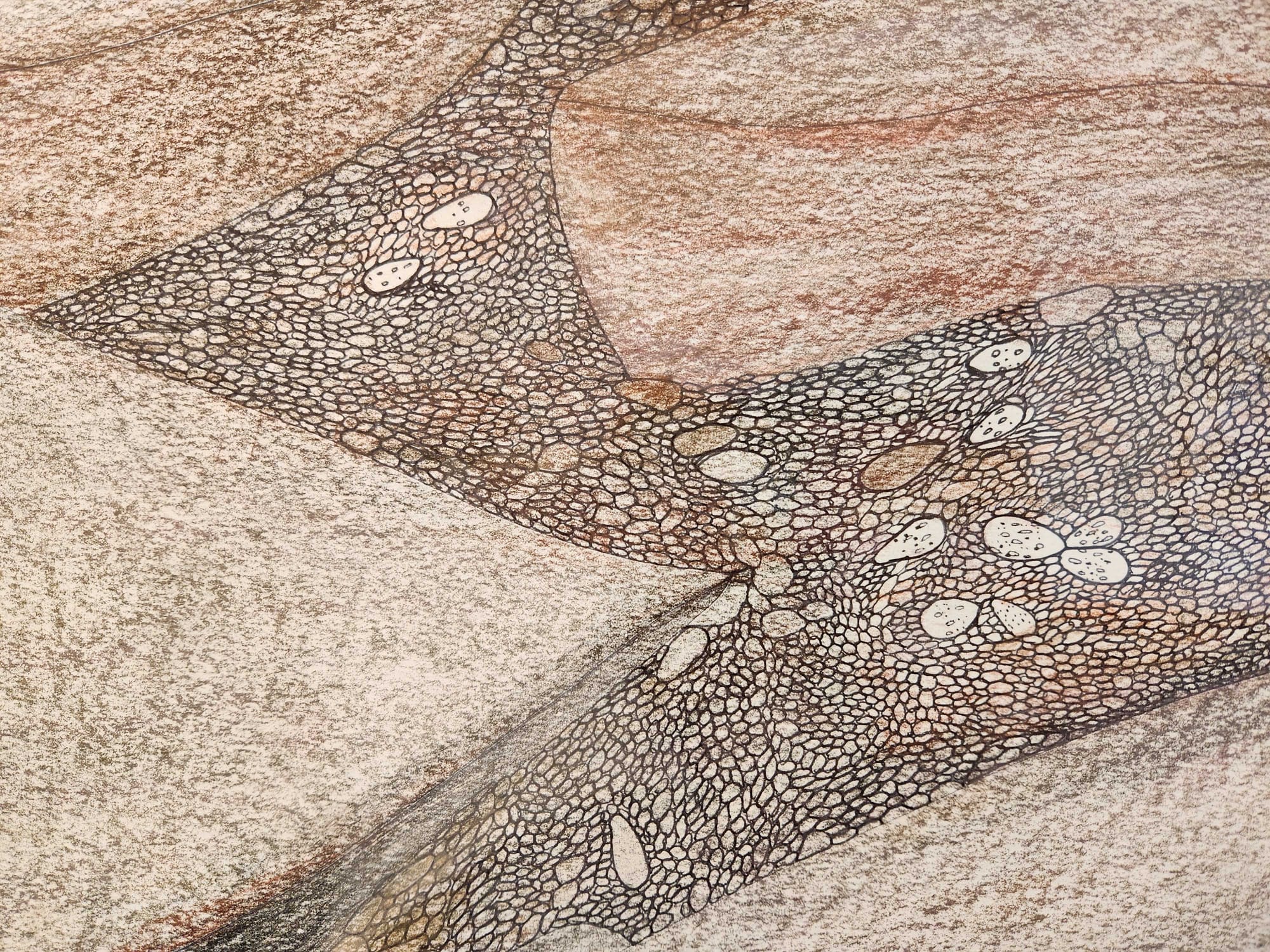 Ashoona's continued fixation with landscapes is also presented at a magnificent scale as she renders the near-imperceptible delineations between sea, snow, and sky, or meticulously captures each stone in the craggy terrain shown in "Eggs and Rocks" (2023). Her landscapes are fluid rather than fixed, often leaning into the cosmic, untethered nature of an ever-shifting aurora borealis and the evolution of flora and fauna in the face of monumental climate change.