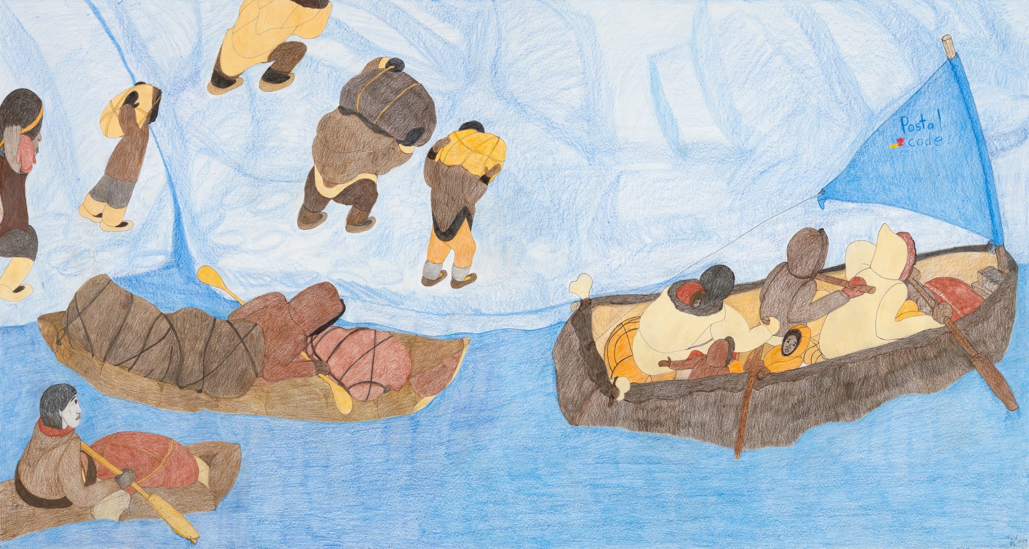 Through 20 drawings created this year, Ashoona presents both enormous events and minute memories on varying sizes of paper, incorporating references to her past works as portals that transcend time. Her memory-based compositions infuse truth coupled with whimsy surrounding life in the Arctic. Highlighting the family- and community-oriented nature of Inuit culture, also modeled by Kinngait Studios, Ashoona's figurative drawings depict people hunting, making art, or simply communing. Deeply influenced by the natural world, Ashoona also transforms her community members and fellow artists into animals, both endemic and fictional, blurring the lines between reality and imagination.