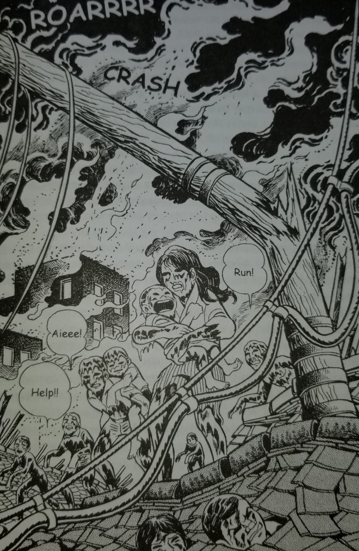 The chapters that focus on the effects of the bombings at Hiroshima and Nagasaki envelop us in a post-apocalyptic landscape. Decamous emphasizes the suddenness of the attack, the surprise and confusion following the blinding white light that incinerated of tens of thousands of people in a matter of seconds. Much of the art produced by these hibakusha — Japanese for a survivor of the bomb, and a term the author uses for any survivor of the events depicted throughout the book — was literature. Novels and autobiographies poured out of survivors who witnessed the bombs’ lingering effects. The bomb caused lifelong, chronic ailments, ranging from body-covering burns to blindness to cancer to birth defects.