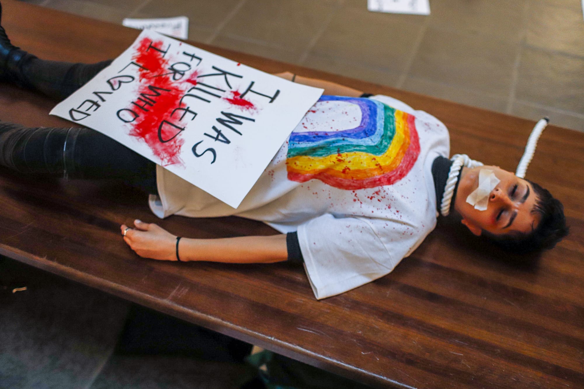 The action was held on the morning of Sunday, December 4, around 10:30am and lasted for about half an hour. Documentation of the "die-in" shows activists splayed out on the floors of The Met, wearing white T-shirts stained with fake blood and holding handmade signs citing the various reasons the Iranian regime has arrested or murdered Iranian protesters onsite. The signs feature statements including "I was filming the protest and they killed me;" "They killed me in your silence;" and "They raped and murdered me in the Islamic Republic prison."