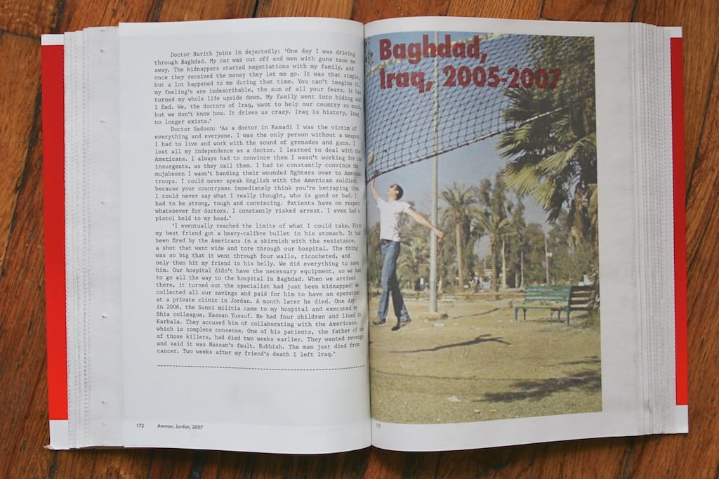 Van Kesteren’s own photos are presented on smaller, glossier, non-newsprint pages throughout the larger collection. They are often presented following a personal narrative from Iraq’s recent history, written by an Iraqi pictured in one of van Kesteren’s photos. While van Kesteren’s photos are excellent in their own right, what really conveys the sense of confusion and loss present in the book are the personal stories, Iraqis kidnapped and held for ransom, relatives killed by American crossfire, smuggled illegal escapes to other countries. While Baghdad Calling doesn’t present a journalistic document of a day-to-day conflict, it represents all too well the chaos, desperation and hardship that have split the country for much of the past decade, as well as the fact that life still persists.