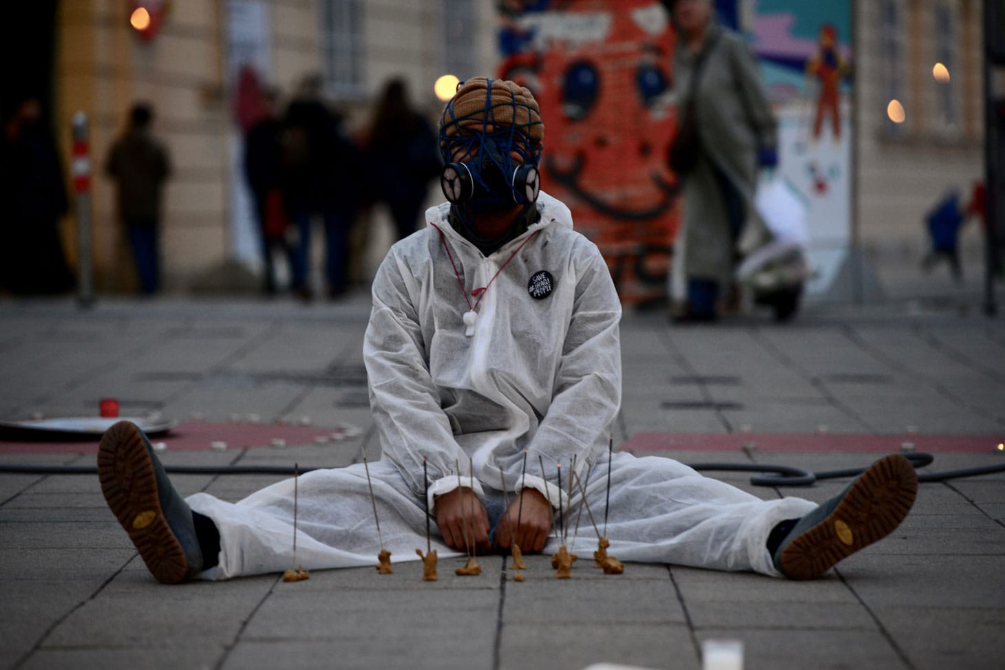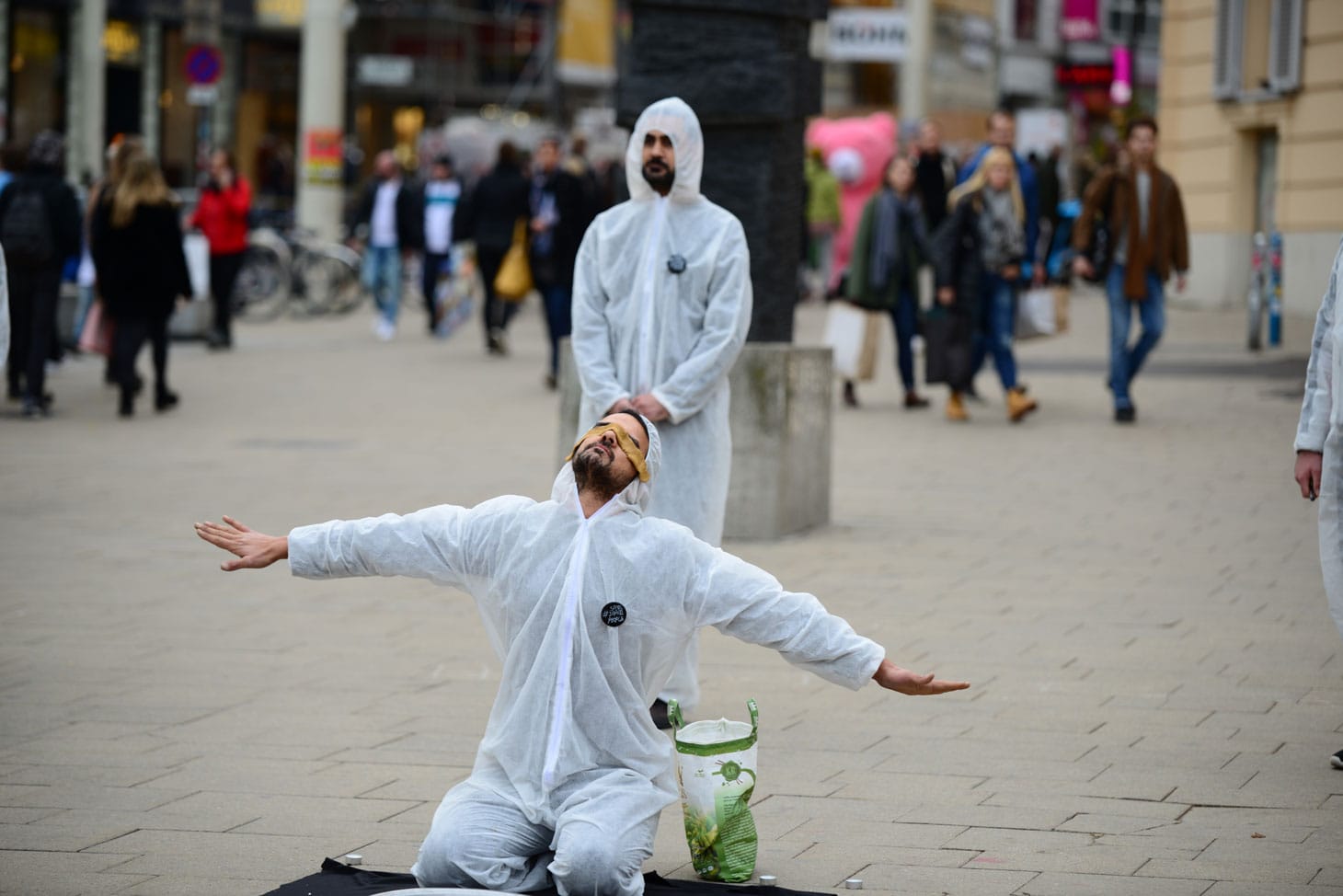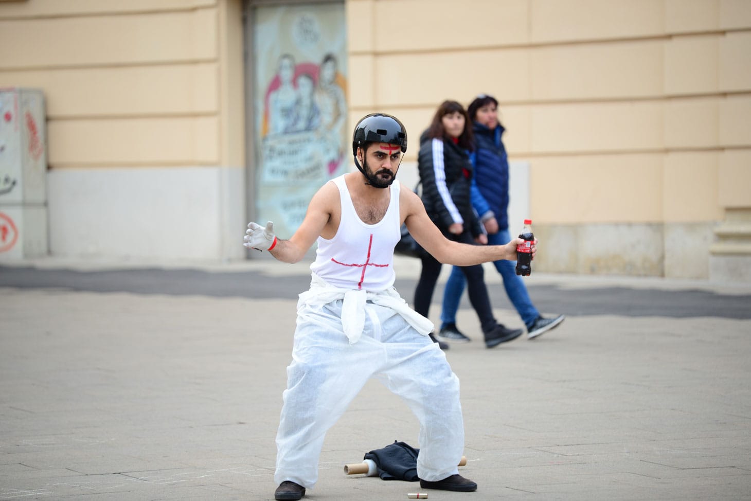 The performances by Iraqi Autumn repeatedly beg the question, Who is the onlooker? Bystanders gather, ask questions, snap photos on their phones. But this doesn’t seem to be the point. The performers aren’t the subject, they’re merely insignia. The streets of Vienna are clean, and protesting bodies clad in clean white painter’s suits mimic a façade of peace. In Baghdad, tear gas has flooded the city’s nooks and crannies. It sticks to everything, says Hussein, a 30-year-old actor who founded a theater group with some classmates from the Baghdad College of Fine Arts a decade ago. The group gained a reputation around Baghdad, which culminated when a public performance of Othello was televised, ultimately causing Hussein to flee the country. Today, protesters in Iraq wash themselves with bottles of Coke, which helps minimize the effects of the gas. They catch the grenades in their arms and throw them back at the police. In Vienna, a performer holds a bottle of Coke toward the sky. He squats in a T-shirt and helmet, the uniform worn by many of the young protesters back home. He draws a red target over his shirt in Reem’s red lipstick. Here I am, he holds out his arms in submission, Come for me.