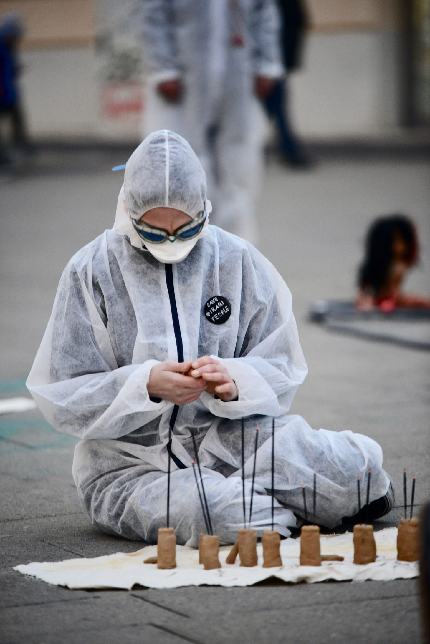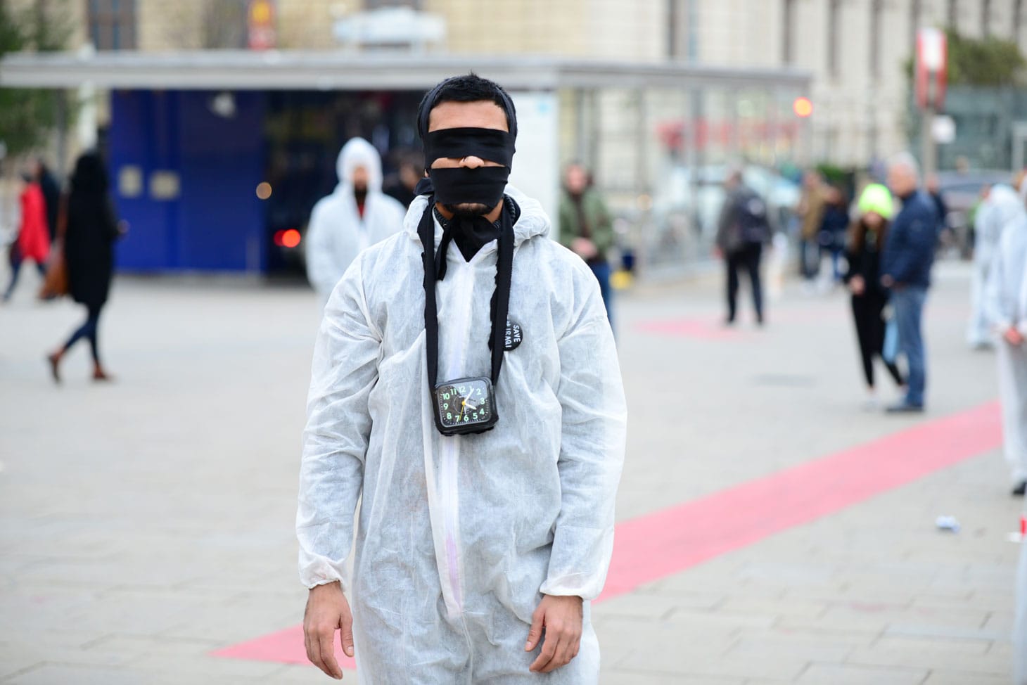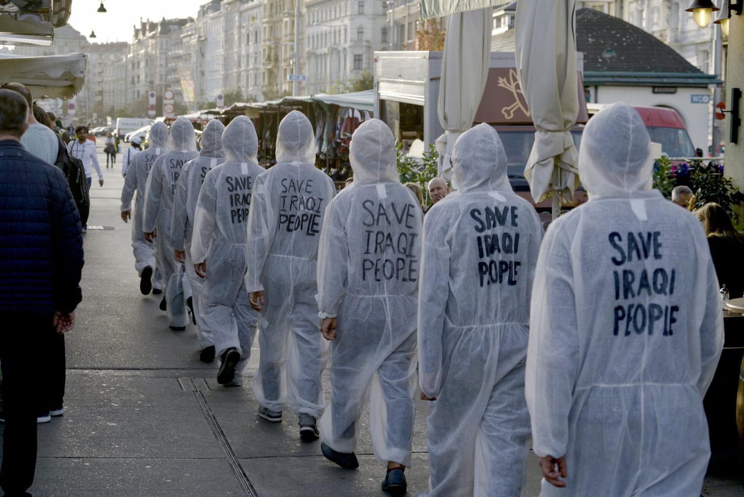 Sixteen bodies in white painter suits stand outside the United Nations in Vienna, the hashtag #save_the_Iraqi_people painted on their backs in black. Laptops sit in their arms displaying a split-screen of images — a man runs through the alleyways of Baghdad at night while yelling into the camera; fires from grenade explosions flash around the screen in a loop. The Vienna-based performance group known as Iraqi Autumn leans on silence as a gesture of dissent, commenting on the silence of the international community regarding the outbreak of violence in Iraq over the past two months.