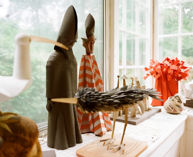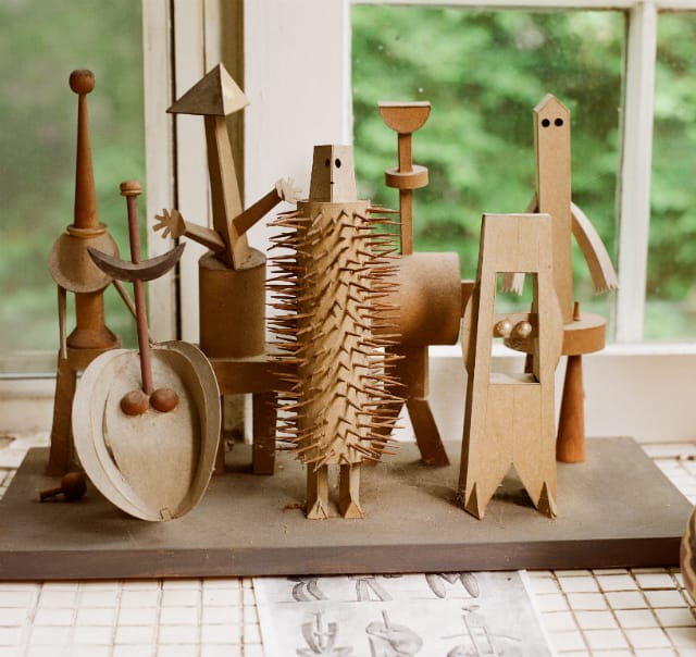 The Metropolitan Museum and galleries around New York were among Harper’s broad inspirations for his paper art, as shown in the numerous African masks, knights, Egyptian cats, and even a relief of a Renaissance Florentine church. He also made three-dimensional versions of the wailing animals in Picasso’s “Guernica,” and a snarling cat lunging at a flailing bird. While the versatile paperboard is the predominant material, he was highly adventurous, just as he had been with his professional designs, and incorporated toothpicks, balsa wood, telephone wire, ping pong balls, and the limbs and eyes of dolls.