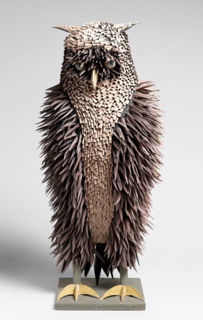 At George Nelson Associates he made his most influential designs, like the atomic clocks and Marshmallow couch, and he also led the design for the Chrysler Pavilion at the 1964 World’s Fair. It was a massive complex with a giant model of an engine people could explore with pounding pistons sending sparks from monster heads, an auto part garden, and even a whimsical rocket as a tribute to the car company’s role in the space program. According to an essay by Julie Lasky in Irving Harper: Works in Paper, this incredibly intense project “almost drove him to knit,” and as an outlet he started to make scuptures. He’d always been adept at modeling for his design work, but these sculptures were purely art. The first was a mask of curves made from a shredded bamboo window blind. His collection would tally around 300 when he completed his last sculpture in 2000: a magnificent owl with downcast doll eyes and brown feathers folded from paperboard.