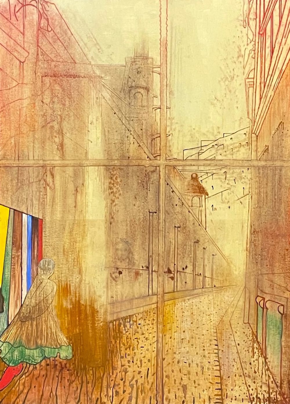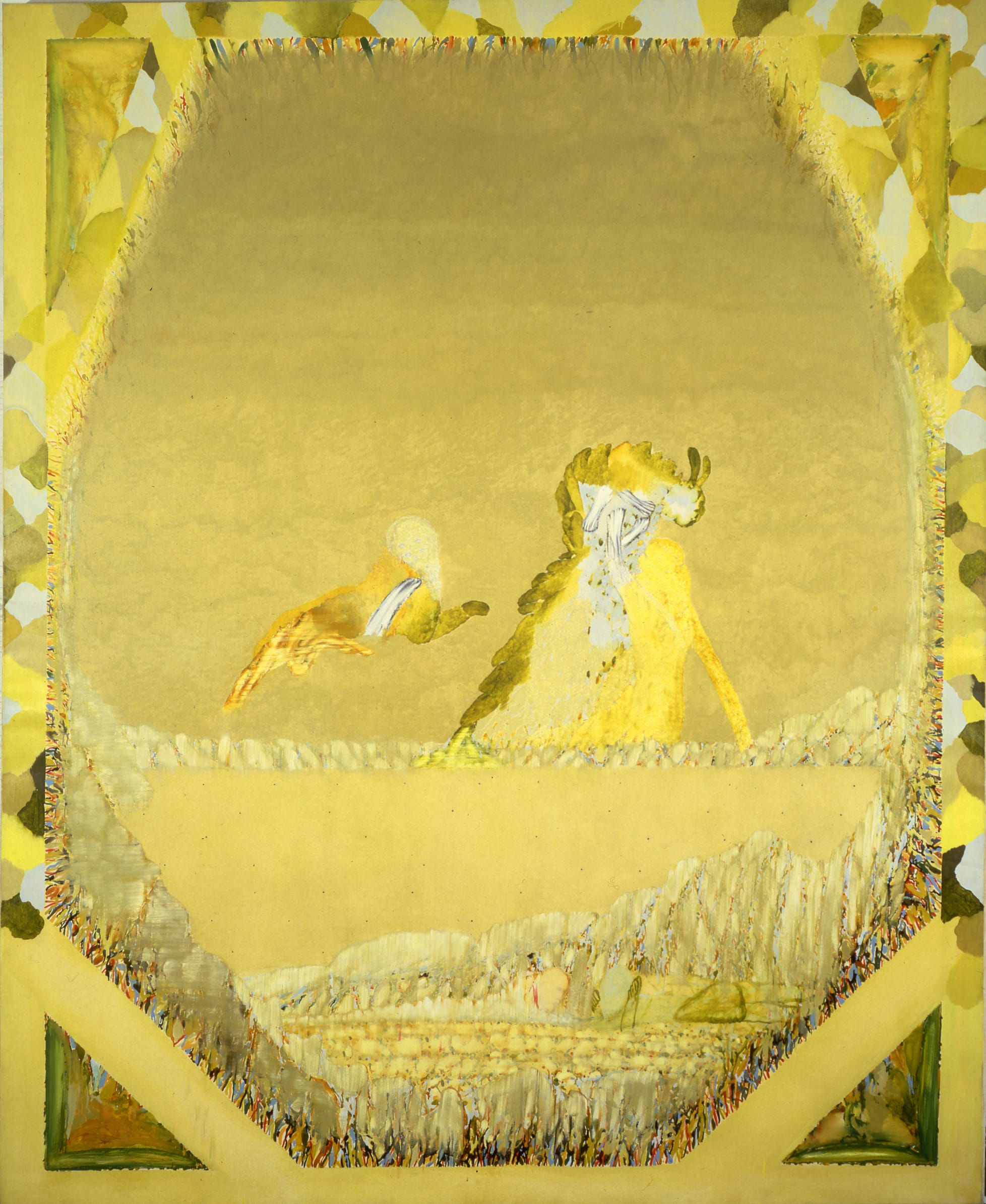 In the largely yellow vertical painting “Second of four mountains” (2001), a view of a medieval French street is quartered by the perpendicular bars of a window. As with the Rubbings from the Calcium Garden series, as well as “La Seine (In Sleep)” and “The Nile (For Sarah),” “Second of four mountains” shows a world to which we are connected, yet seems to lay beyond our reach. The faint profiles of horses float above a woman on the left, while a barely visible face lingers in front of her. She walks down an empty cobblestone street that vanishes in the distance. We are always surrounded by the ghosts of history. Who will remember us when we are gone?