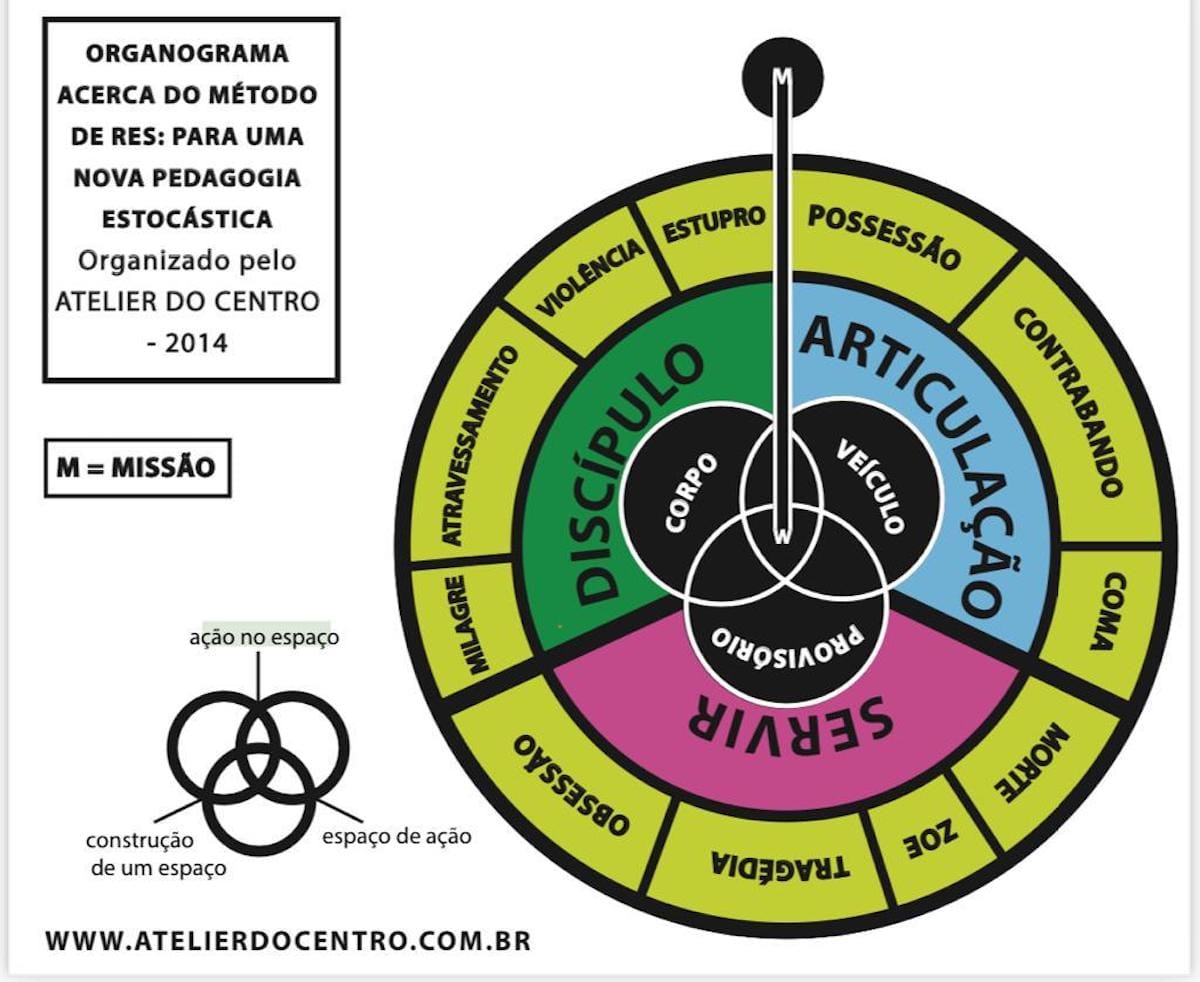 Hyperallergic obtained access to a revealing diagram constructed by students under Espirito Santo’s instruction during a class at the Atelier in 2014. Titled "Organizational Chart of the RES Method: Towards a New Stochastic Pedagogy," the diagram is a circle divided into named parts. The word discípulo ("disciple") in bright green directs to the moss-green words estupro ("rape"), violência ("violence"), atravessamento ("crossing"), and milagre ("miracle").