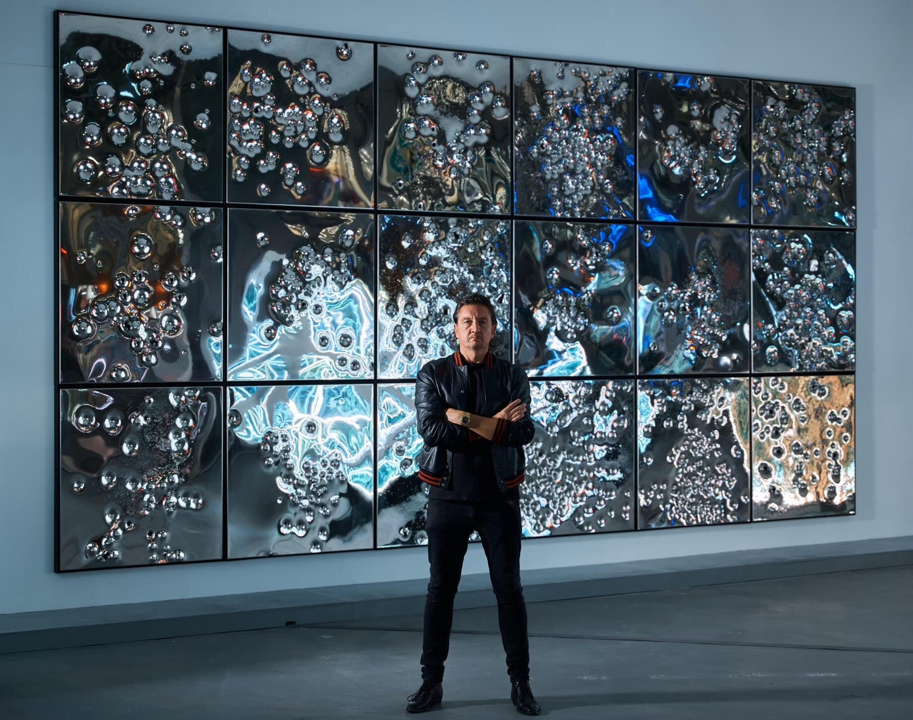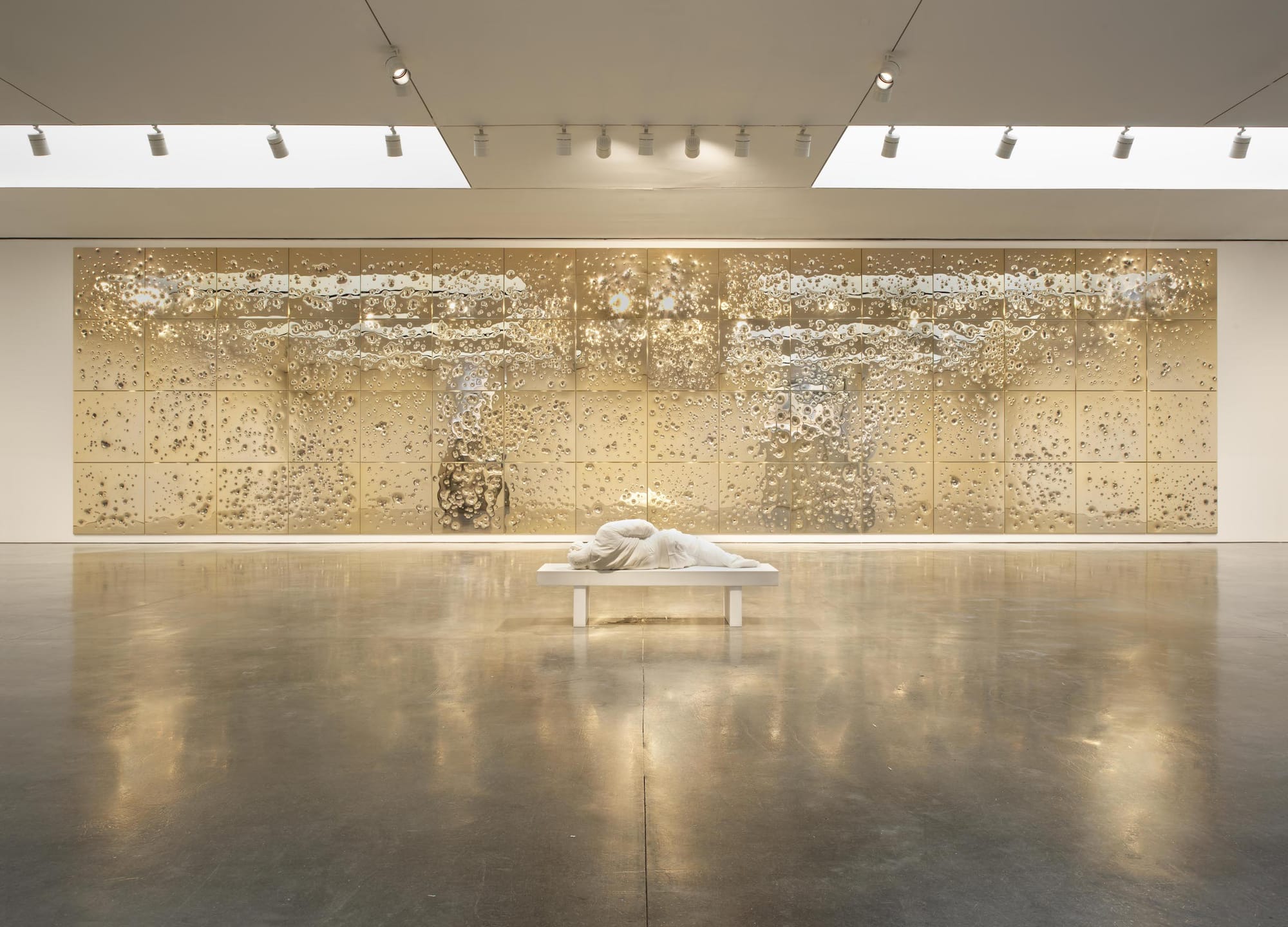On April 30, two exhibitions featuring metal sheets marred by torrents of gunfire went on display on opposite sides of Manhattan. In Midtown East, Opera Gallery unveiled British-American artist Anthony James’s Shots Fired, a show consisting of mirror-polished steel works dimpled with an array of bullet cavities he has been creating since 2011. That same evening, across town at Gagosian’s Chelsea location, Italian conceptual artist Maurizio Cattelan, debuted Sunday — a new large-scale installation involving 24-karat gold panels similarly pockmarked by bullets.