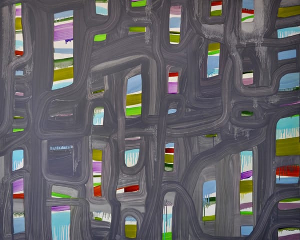 Stephanie McMahon’s “Thaw” from 2011 also taps gray as a team player for her other colors. Gray lines coil together like the lattice of a birdcage. This composition creates several small white openings that make the work feel like a quilt of mini-paintings. Seeing these more boisterous colors framed by this much gray was like experiencing them on visual steroids.