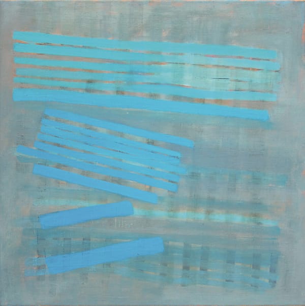 In “Bemist” (2011), Julie Shapiro places a set of light blue stripes in a gray field. The lines looked so bright, intense and almost neon because they float on layers of gray. More muted blue lines are buried in the composition and all this adds formal density to the work, particularly on the lower-right corner.