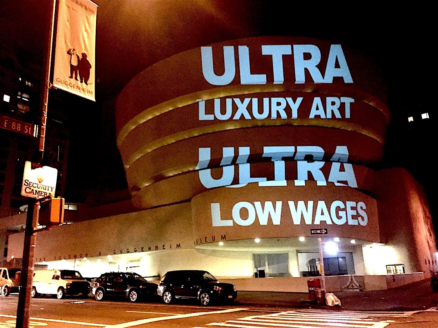 It's worth noting that the Guggenheim's recognizable exterior has been the site of many projections and demonstrations in its history. Artists and activists turned the lights up on the façade in 2014 after reports of migrant labor exploitation and abuse on Saadiyat Island in United Arab Emirates, the site of the forthcoming Guggenheim Abu Dhabi location. The façade was activated again in 2016 after the Guggenheim Foundation withdrew from negotiating with the Gulf Labor Coalition ahead of the museum's construction, and once more in 2020 in an act of solidarity between the museum's unionized workers in New York and the laborers in Abu Dhabi. Visual AIDS also staged a projection in December 2015 with the artist-collective the Illuminator as an acknowledgement of World AIDS Day/A Day Without Art.
