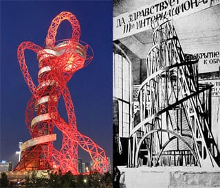 Take Anish Kapoor’s 2012 London Olympics monstrosity, the ArcelorMittal Orbit viewing tower; a kind of flaccid, unwittingly ironic version of Vladimir Tatlin’s “Monument to the Third International” designed in 1920 yet never realized. The fact that Kapoor’s red, steel tower is named after “the world’s leading integrated steel and mining company,” who bankrolled the entire project after a meeting between the company’s CEO Lakshmi Mittal and London Mayor Boris Johnson in the bathrooms of the 2009 Davos Summit, pretty much says it all.