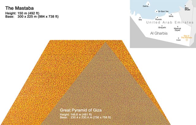 The Mastaba, which has been estimated at a cool $340 million, will be built from nearly 400,000 oil barrels forming the shape of a flat-topped pyramid planned to be taller than the Great Pyramid of Giza. And although Christo has denied that the use of oil barrels comments at all on the UAE’s oil wealth (citing his 1960s work “Iron Curtain” when he blocked off a Paris street with oil drums), it is not just oil that is being commemorated here.