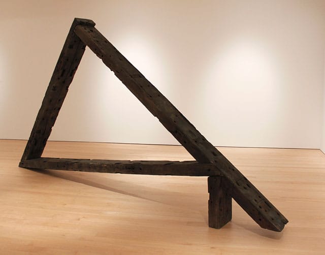 In an odd way, the unprepossessing, almost cartoonish backward tilt of the horse’s skull and forward thrust of its nose relates to the floor-bound triangles of the 1970s wood sculptures — one of which is planed and painted while the other two are raw and rough. The wood constructions look almost as if they could be armatures for the plaster horse.