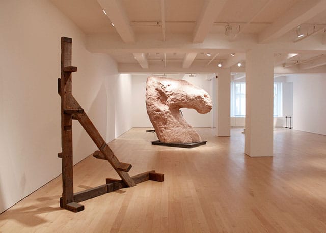 There’s a little bit of truth in each assessment, though at 77, Tucker remains a sculptor to reckon with. The show, which is at McKee Gallery, surrounds a monumental plaster horse’s head (100 x 109 x 61 inches), completed this year, with several large-scale minimalist constructions, mostly out of planks of wood, which the artist made in the 1970s.
