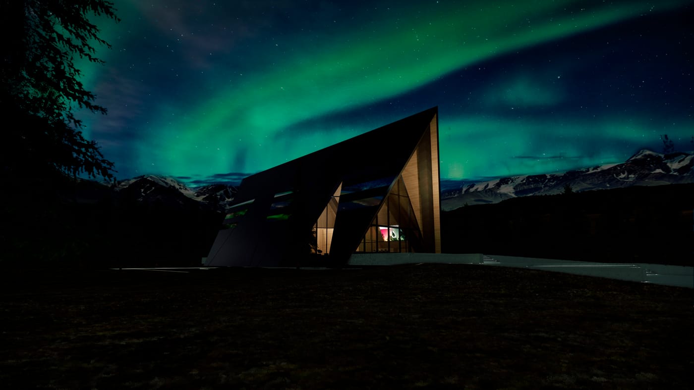 In addition to Midcentury aesthetics that reference the original era of nuclear design, A-frames are the strongest truss construction, and therefore ideal to house and protect the working aspects of the power plant — including supporting cranes that move works within the plant — but the angle of the sides also aligns well with the solar array that will tie into the power processing. In high-snow and lower-light latitudes like Alaska, the A-frame roof angle sheds snow and maximizes the exposure to sunlight. But Oklo also has more fanciful ideas for the panels, hoping to employ Sistine Solar in the implementation of custom solar panel designs, including one commissioned from artist Forest Stearns for the Aurora design, that creates a reflection of the Aurora Borealis-touched Alaskan sky.