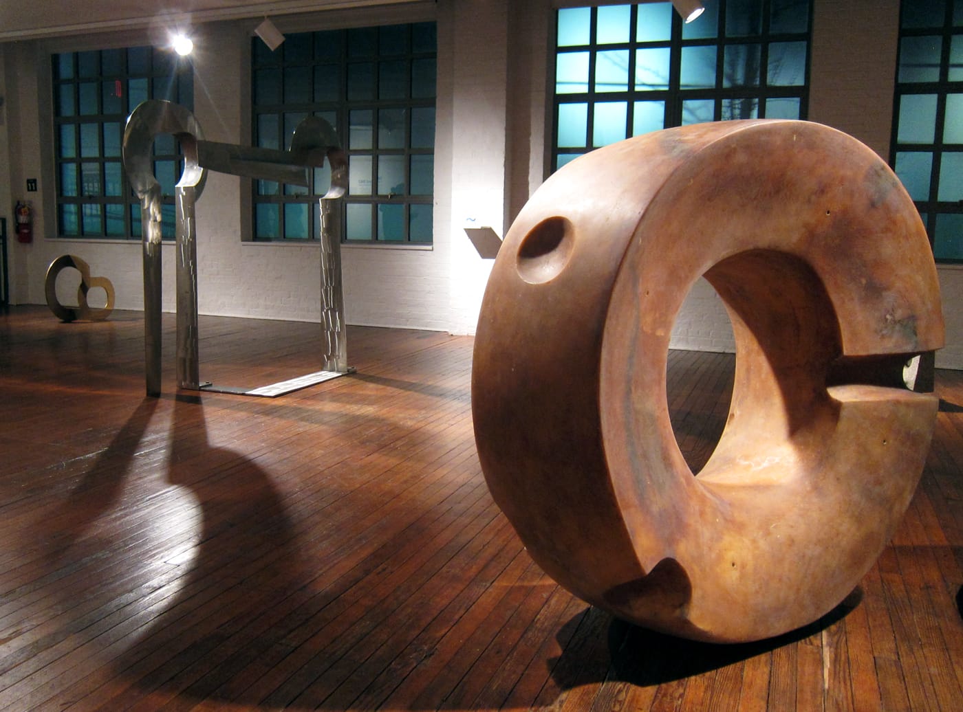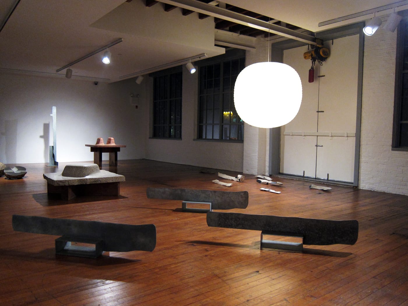Noguchi, who regarded the entire planet as an artwork, saw potential in all its landscapes. Though relatively sparse and unvarying, the Arizona desert was emblazoned in his mind and emerged in many abstracted forms in the decades after his release. A synthetic landscape in one gallery recreates an industrial desert, bringing together works made between the 1960s and ’80s. Obsidian fragments and sheets of galvanized steel remind of the low, textured ridges of the red wilderness; hanging above the severe floor works is an iconic Akari light sculpture, representing a large, hot sun.