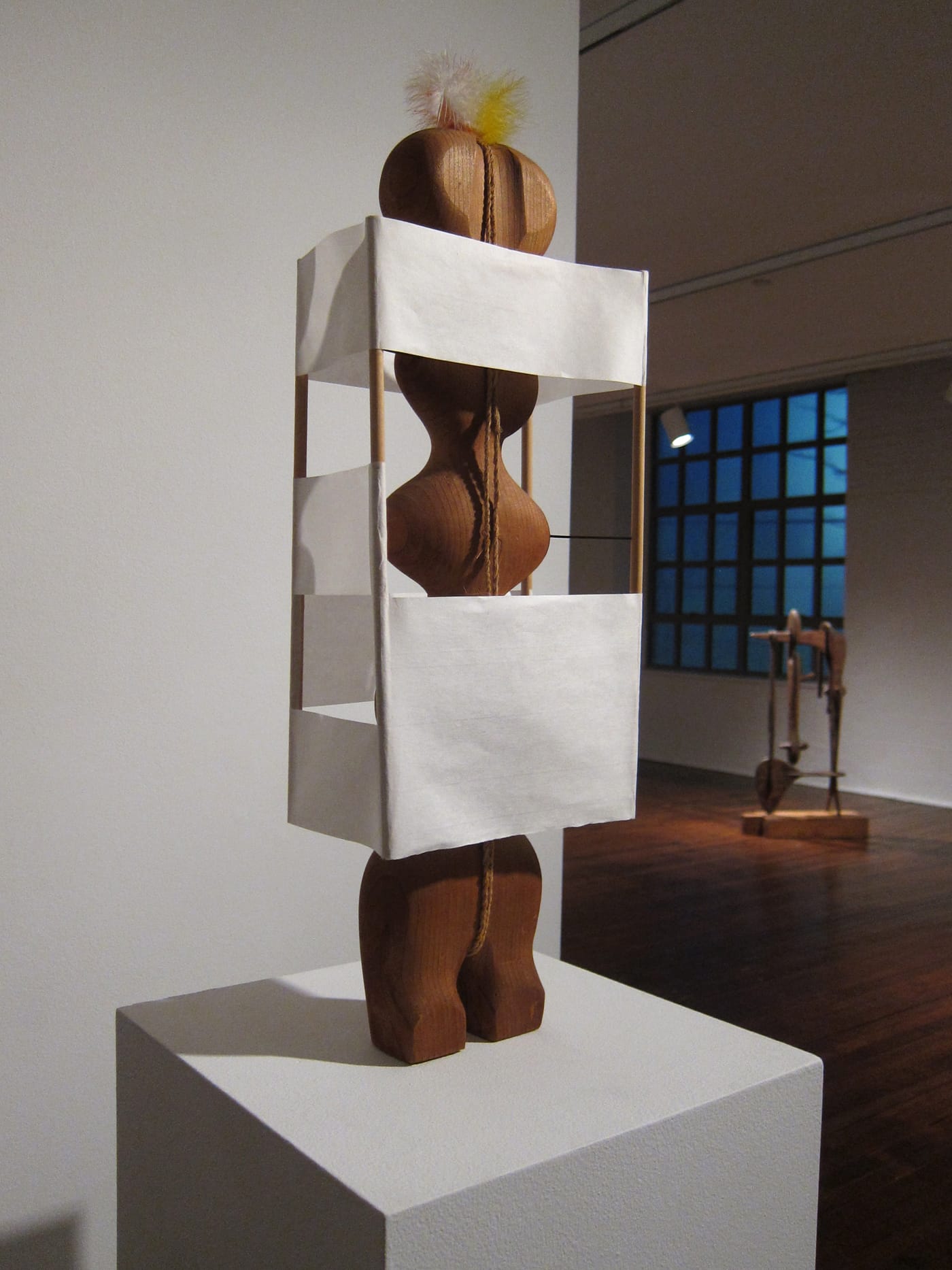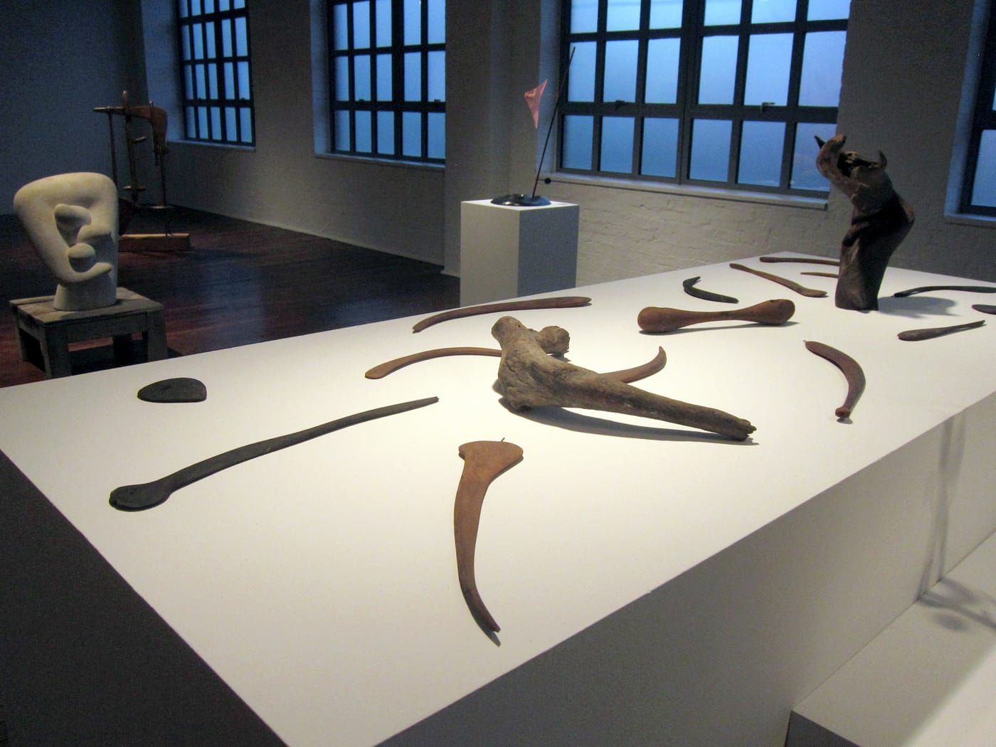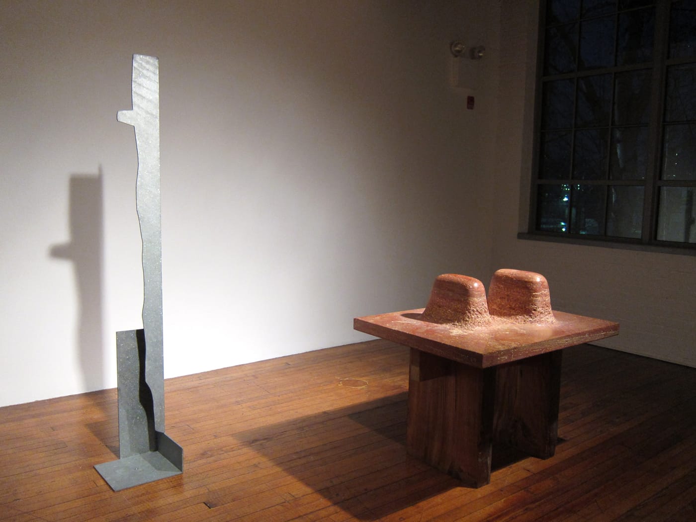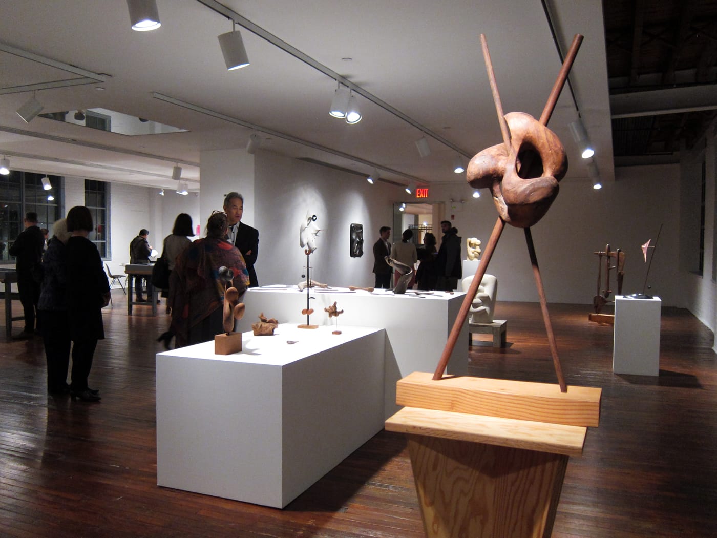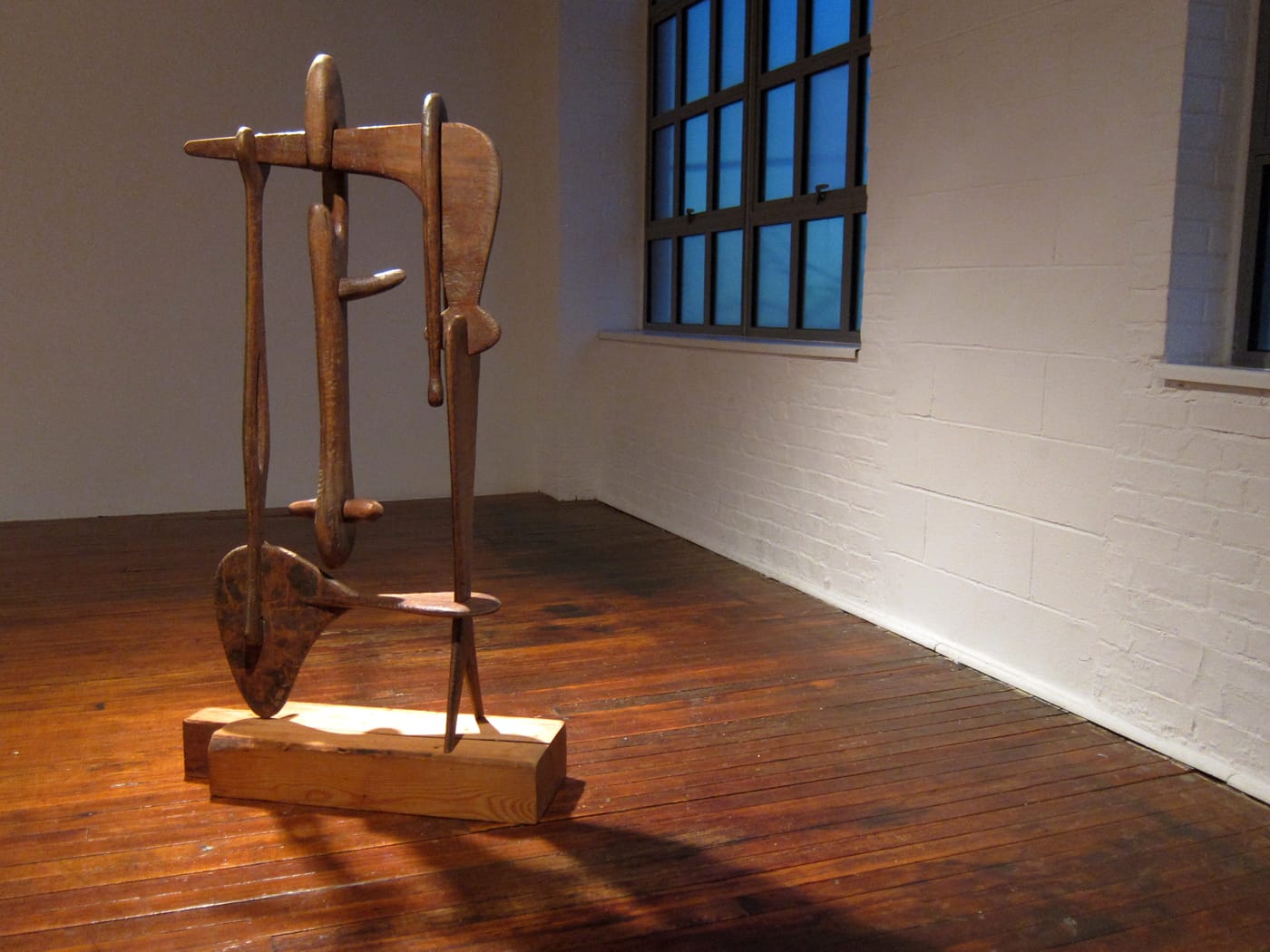 It took Noguchi five months longer to leave Poston than he anticipated; documents pertaining to his release reveal the bureaucratic complications involved in receiving permission to leave. A questionnaire he had to fill out was a test of his loyalty to the United States, posing questions about his ties to Japan and Japanese communities. While he waited to exit the camp, Noguchi walked the desert and sculpted with wood, the material most readily available. One document from a shipping company reveals he was sending 475 pounds of possessions gained in Poston to New York. Most of it was likely ironwood roots he picked up for future use. Two branches rest on a table in the exhibition, representing these morose souvenirs that never made it into complete works.